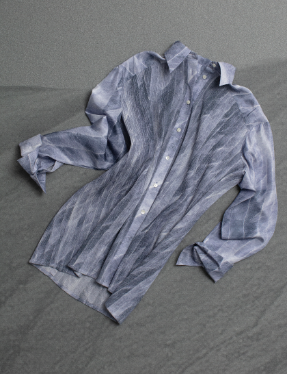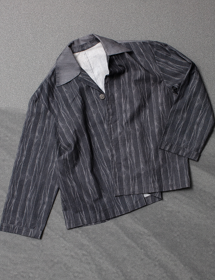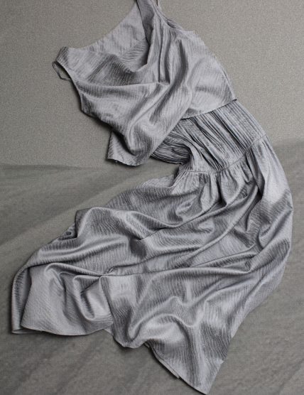 Set against the primal forces of nature, Molten explores the transitory state of creation and change. Handwoven fabrics with weight, fall, metallic shine and structure echo fluidity and viscosity, with occasional use of traditional weaving techniques such as Tanchoi and space-dyed silk.