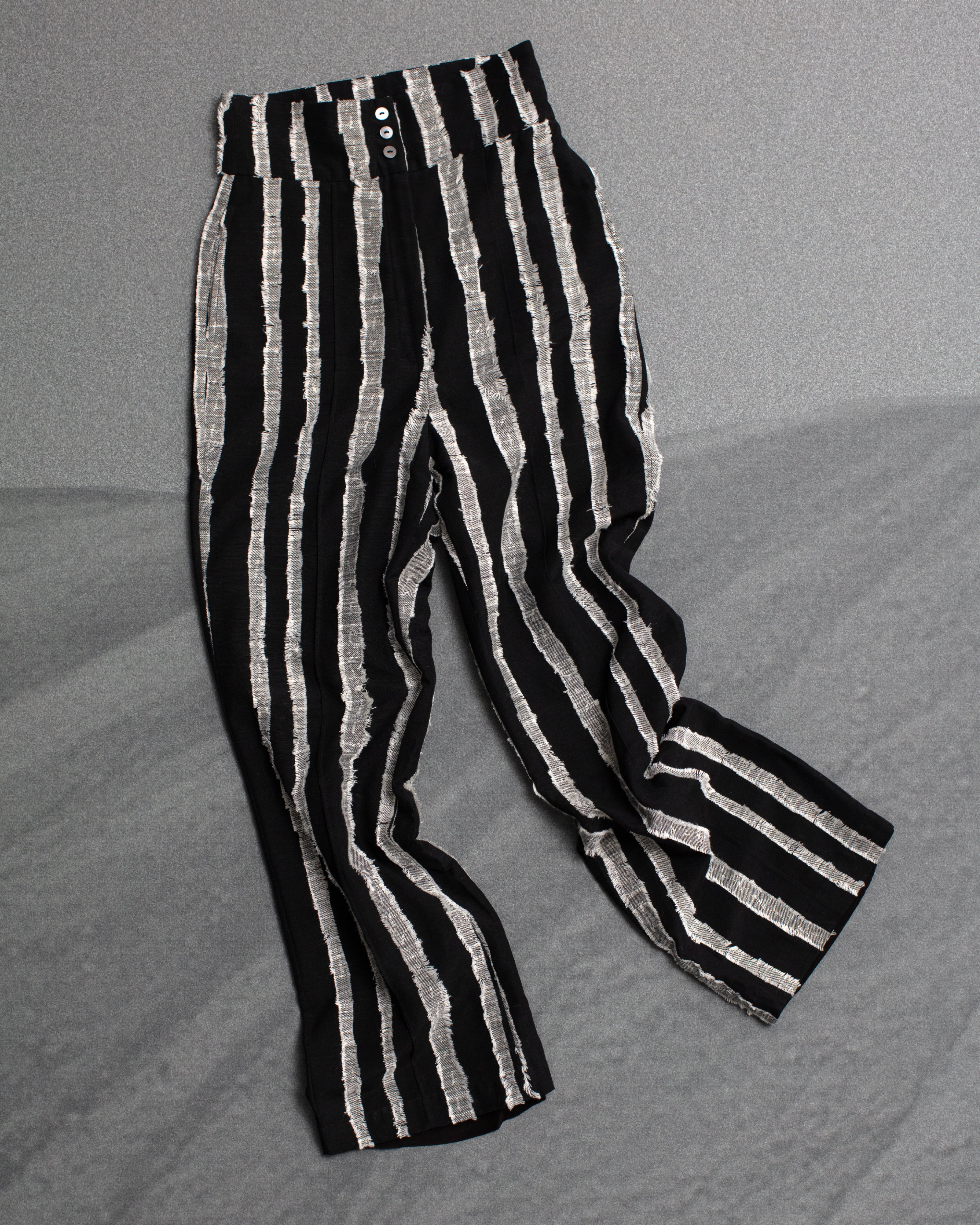 Our ankle-length Charcoal trousers feature handwoven stripes inspired by nature’s rugged textures. Defined front creases, a concealed fly, and carved mother-of-pearl buttons add refined structure.