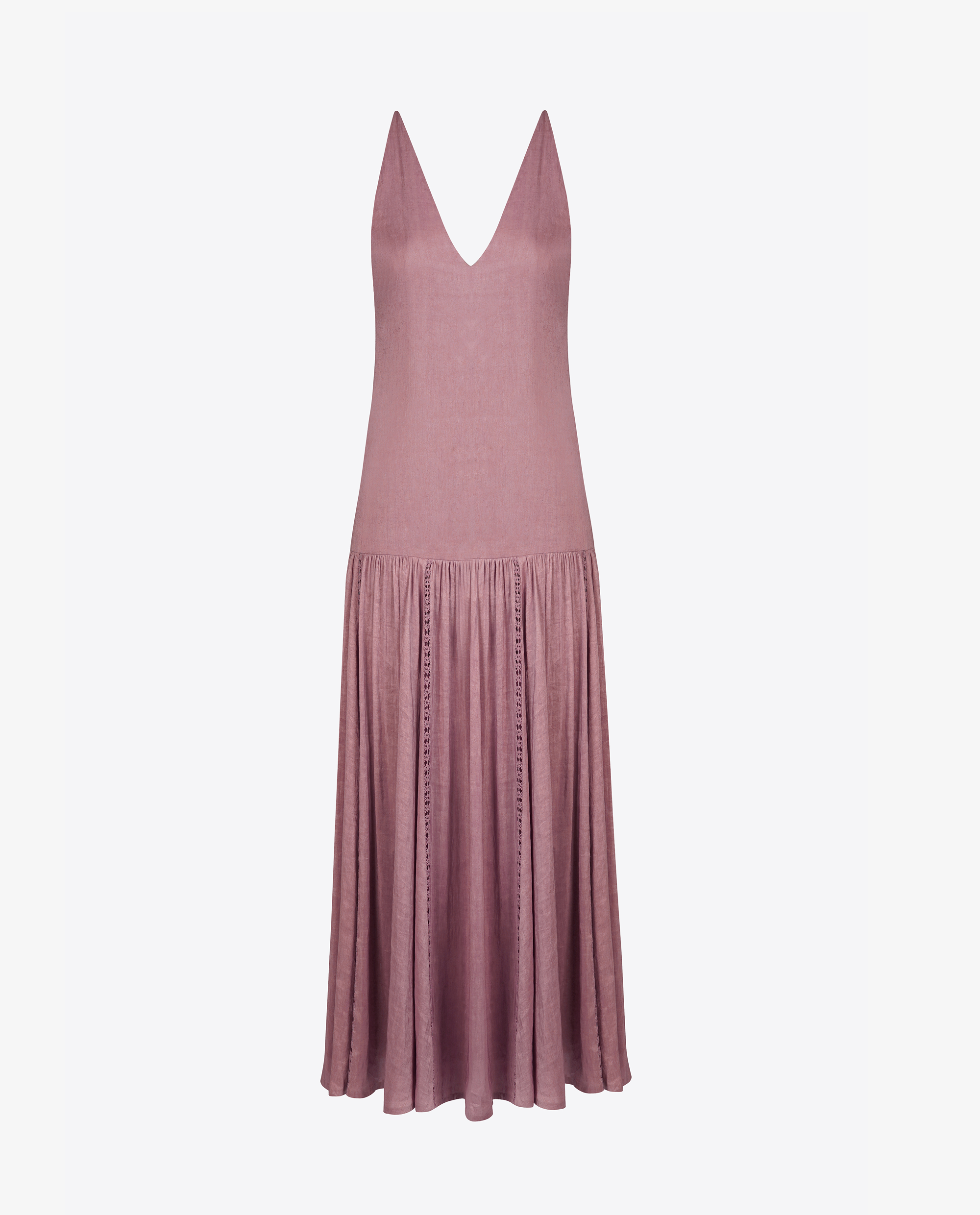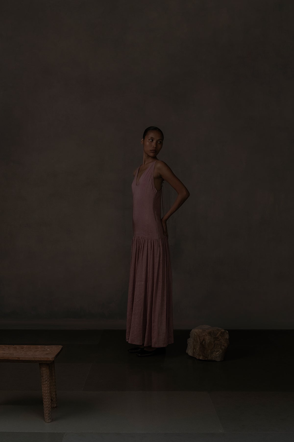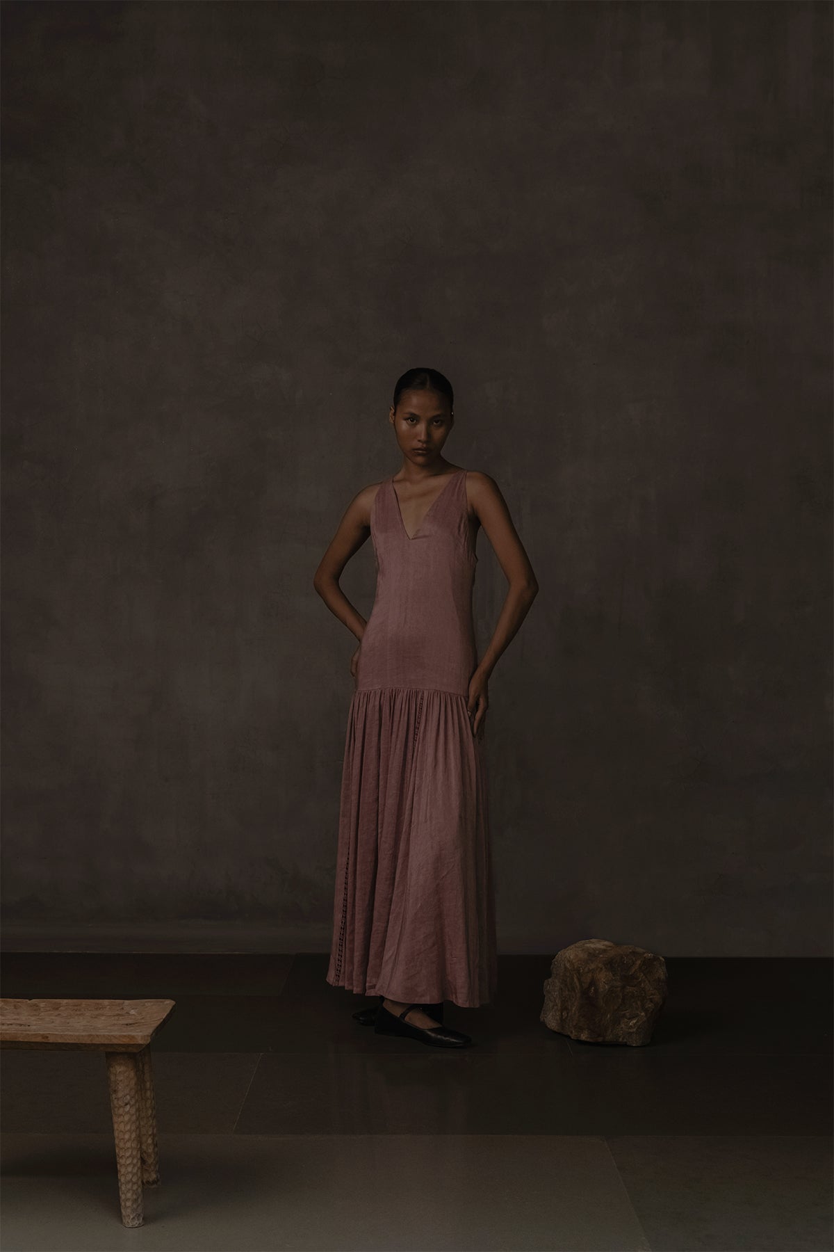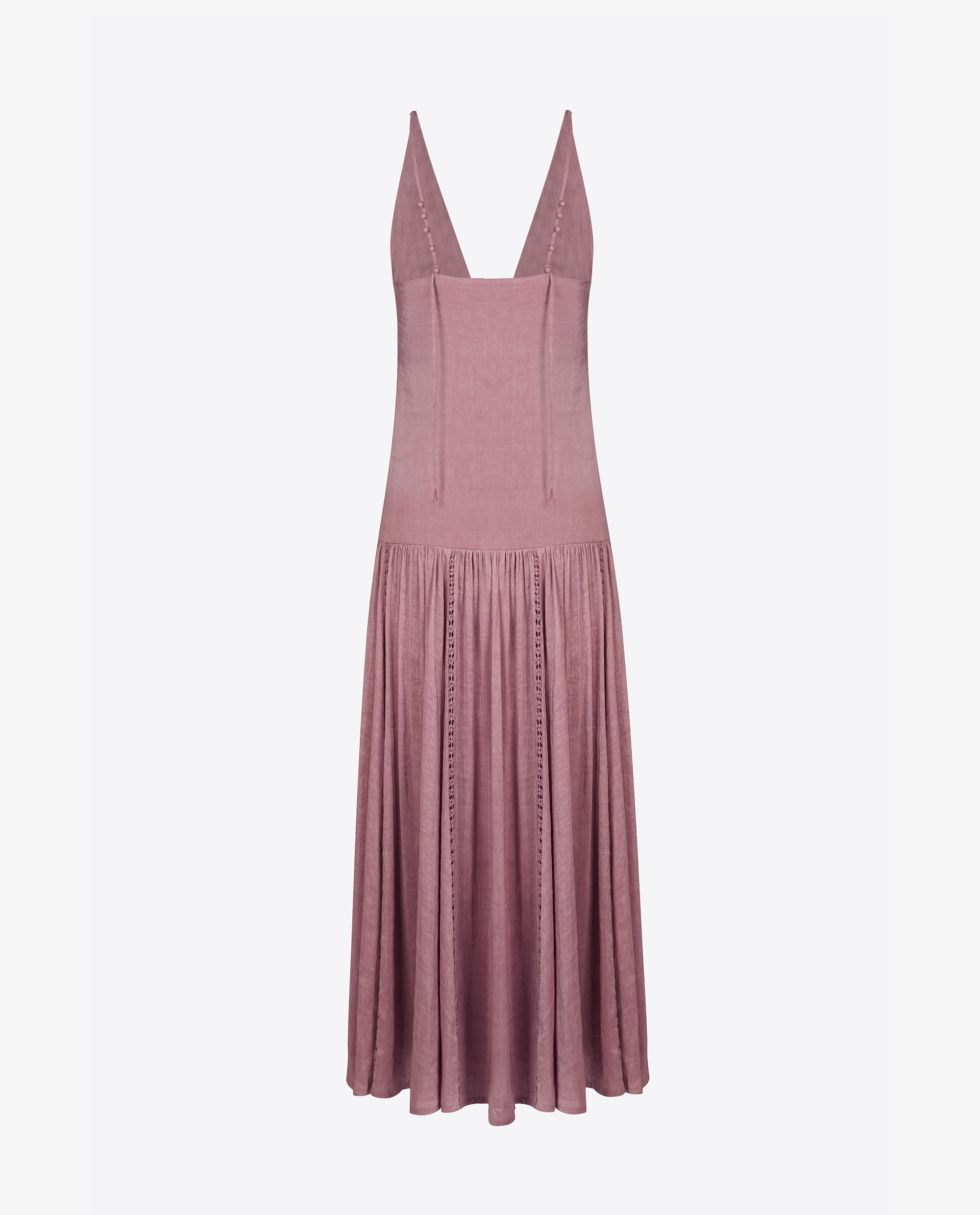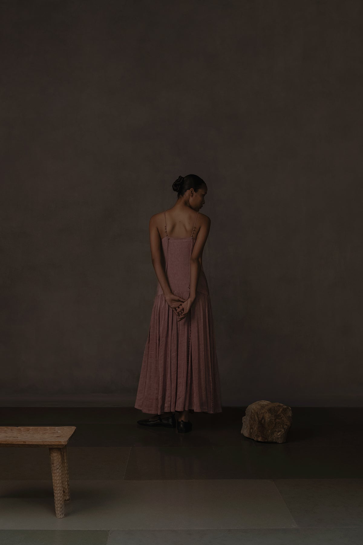 A 1920s-inspired silhouette in wounded blush rose, this dress is adorned with analogue details such as vertical hand-needled and embroidered lace panels on the flowing skirt, and slender handcrafted straps that adjust with buttons and fall gracefully along the back.