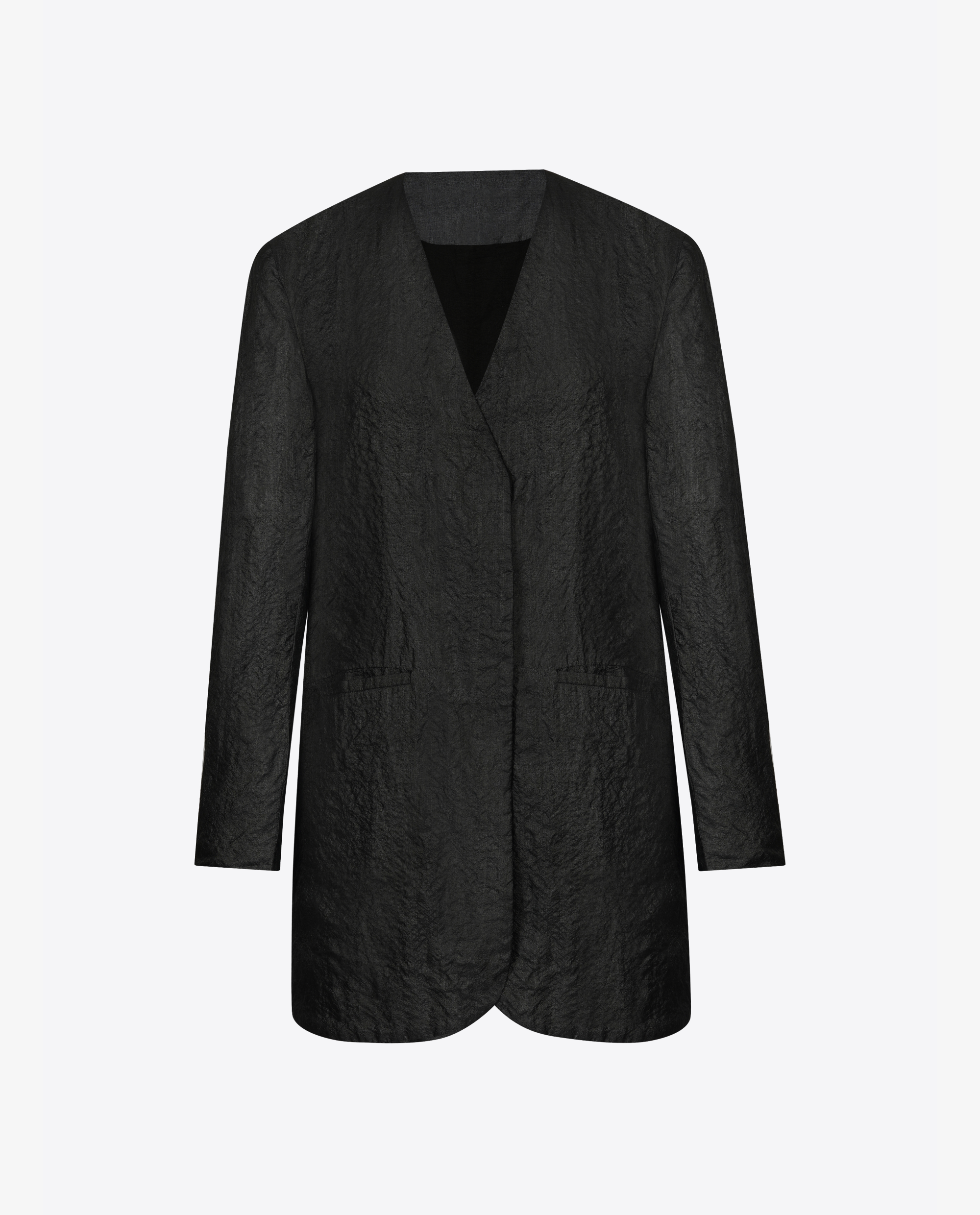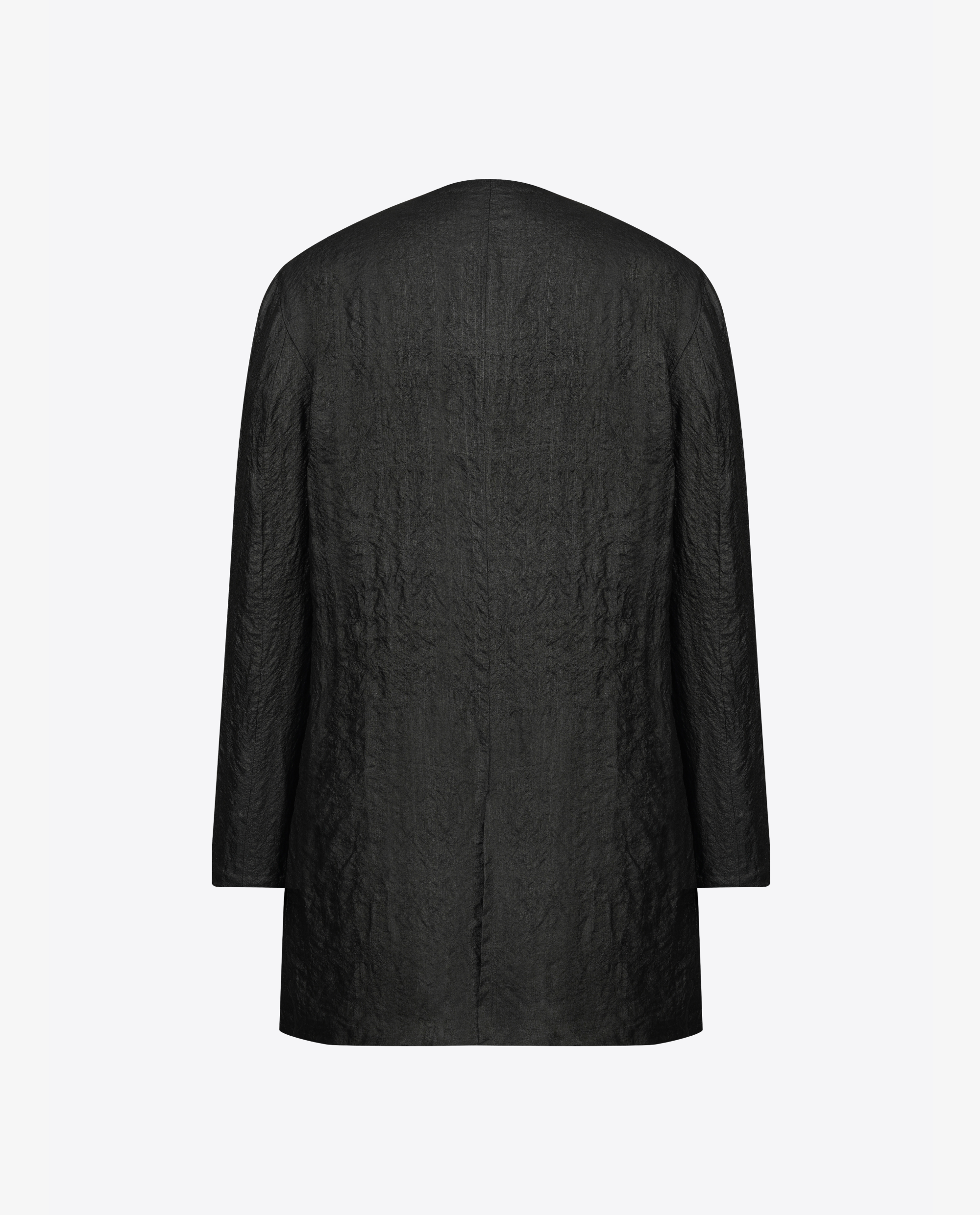 A cleanly tailored jacket in crinkled Tussar silk, handwoven over 12 hours, falls just past the hip. Light shoulder pads provide gentle structure, while two welt pockets and a concealed buttons closure maintain a refined silhouette. Lined in soft cotton mulmul.