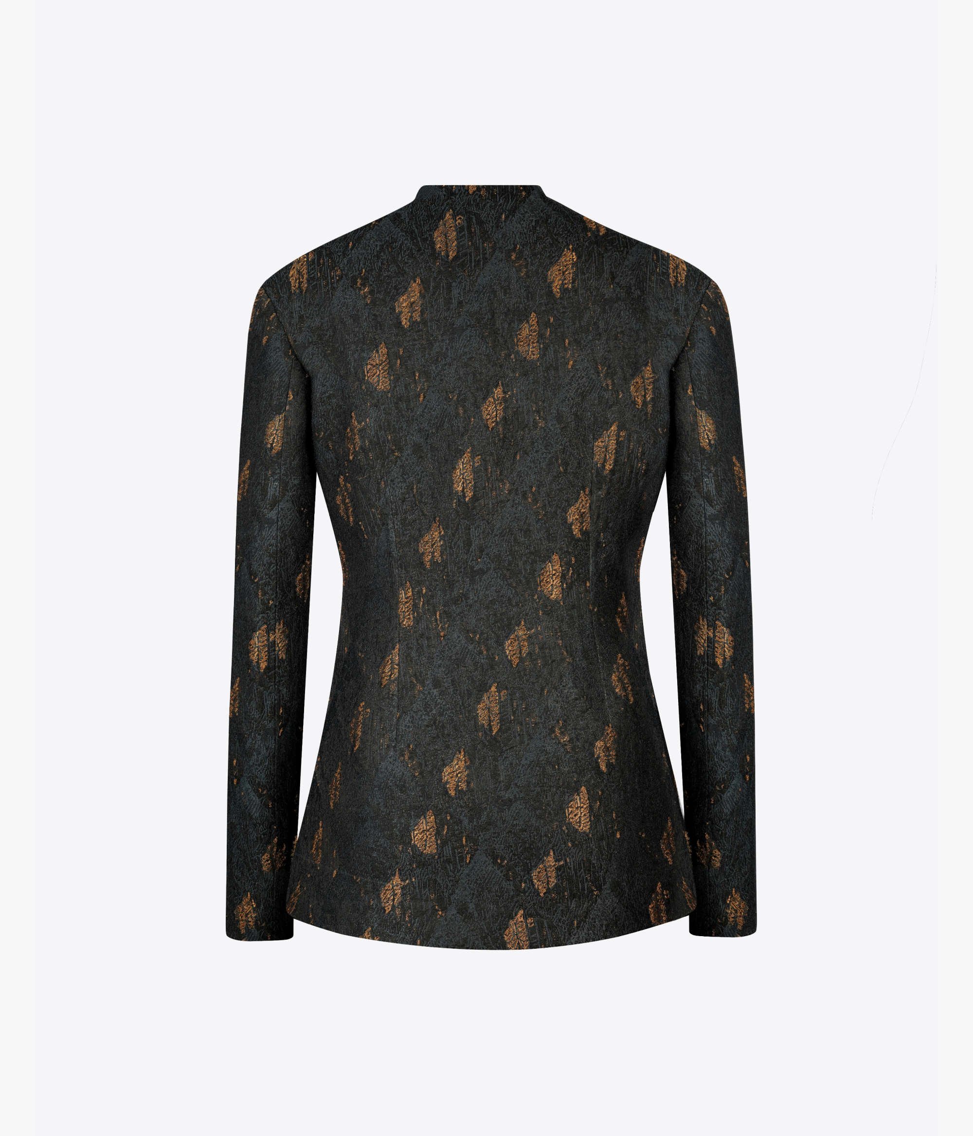 Classic lapel-less blazer in charcoal, handwoven in our Varanasi studio using a blend of silk, muga, cotton, and gold zari.The structured silhouette showcases a refined texture, with abstract gold zari patterns woven throughout for a subtle, regal effect