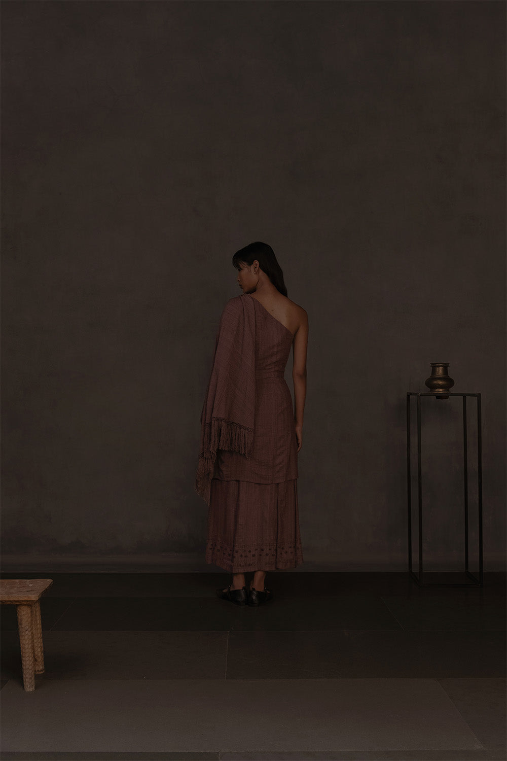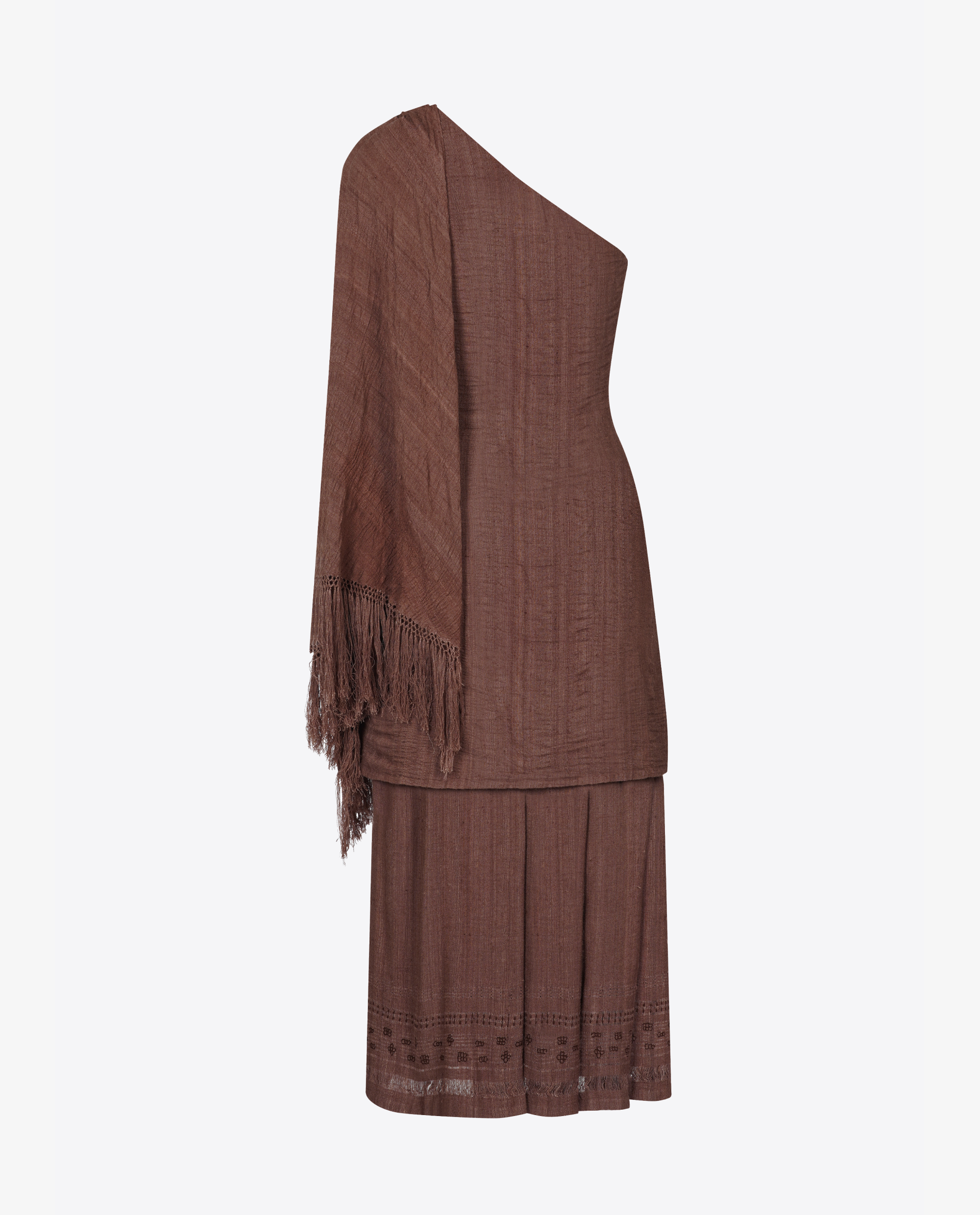 Woven from Eri Silk in pale blush rose, the handspun weft takes several hours to produce, creating a textile with natural thermal properties that keeps the wearer cool in summer and warm in winter. A concealed side zipper and hook ensure ease of wear, woven over 35 hours.