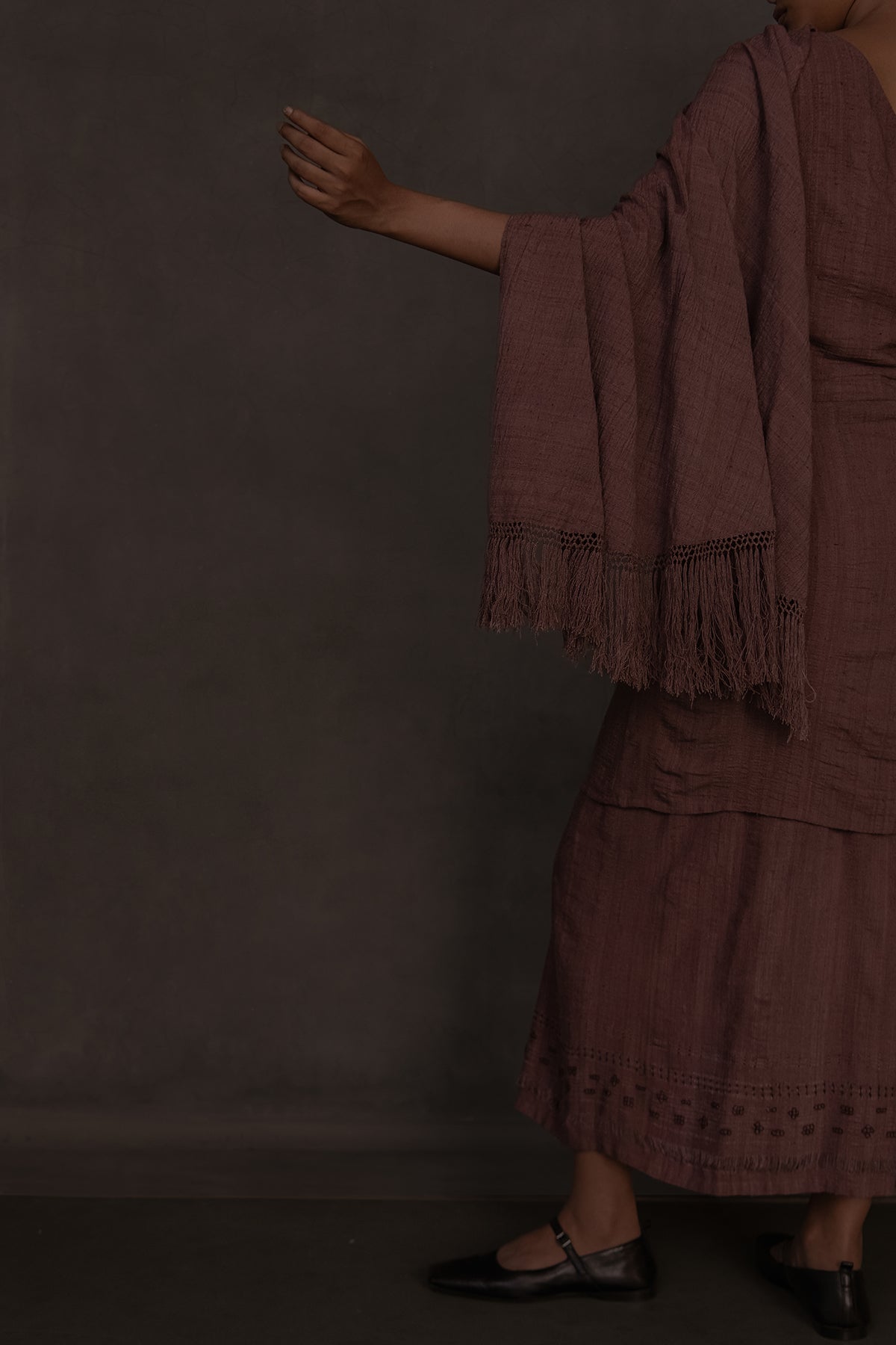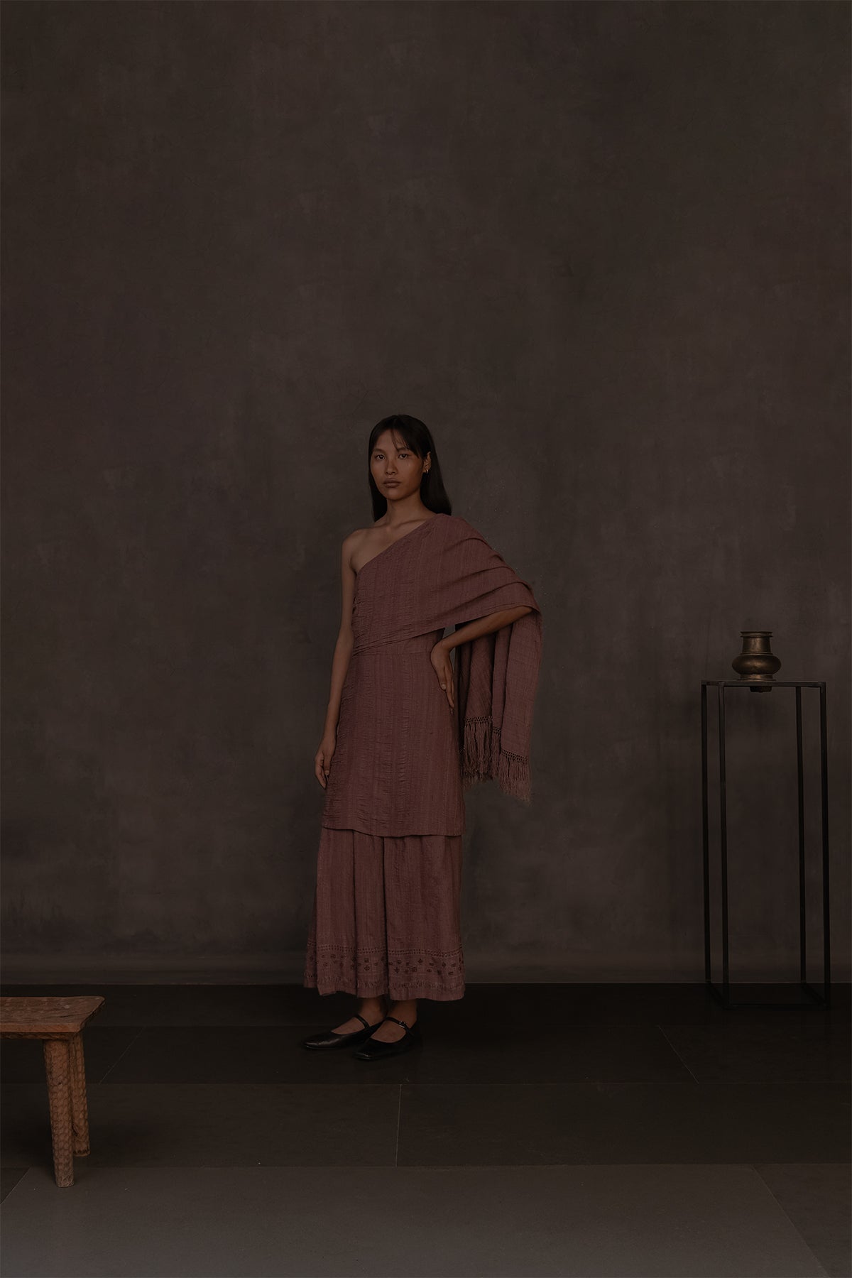 A modern rendition of the saree, this ensemble draws inspiration from pre-colonial India. The free-flowing palla falls behind, revealing delicate handcrafted knotting and fringes, while pleats in the skirt feature a border of meticulous hand-done cutwork and needlework lace.