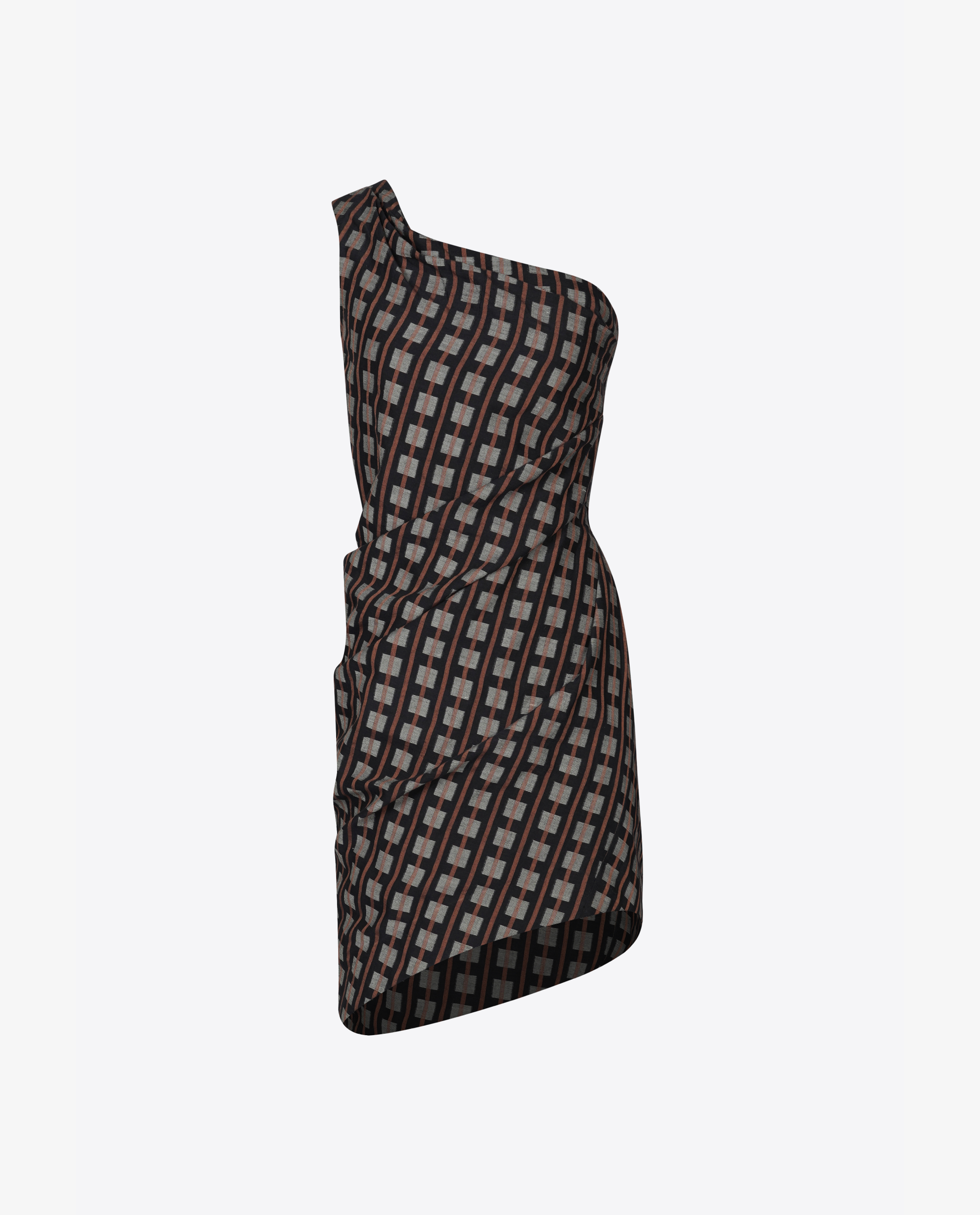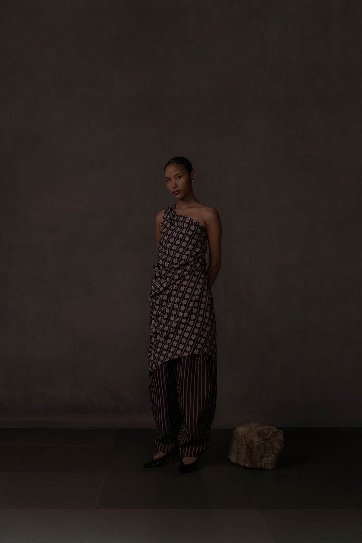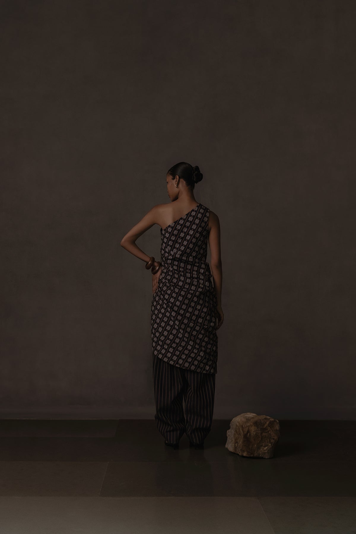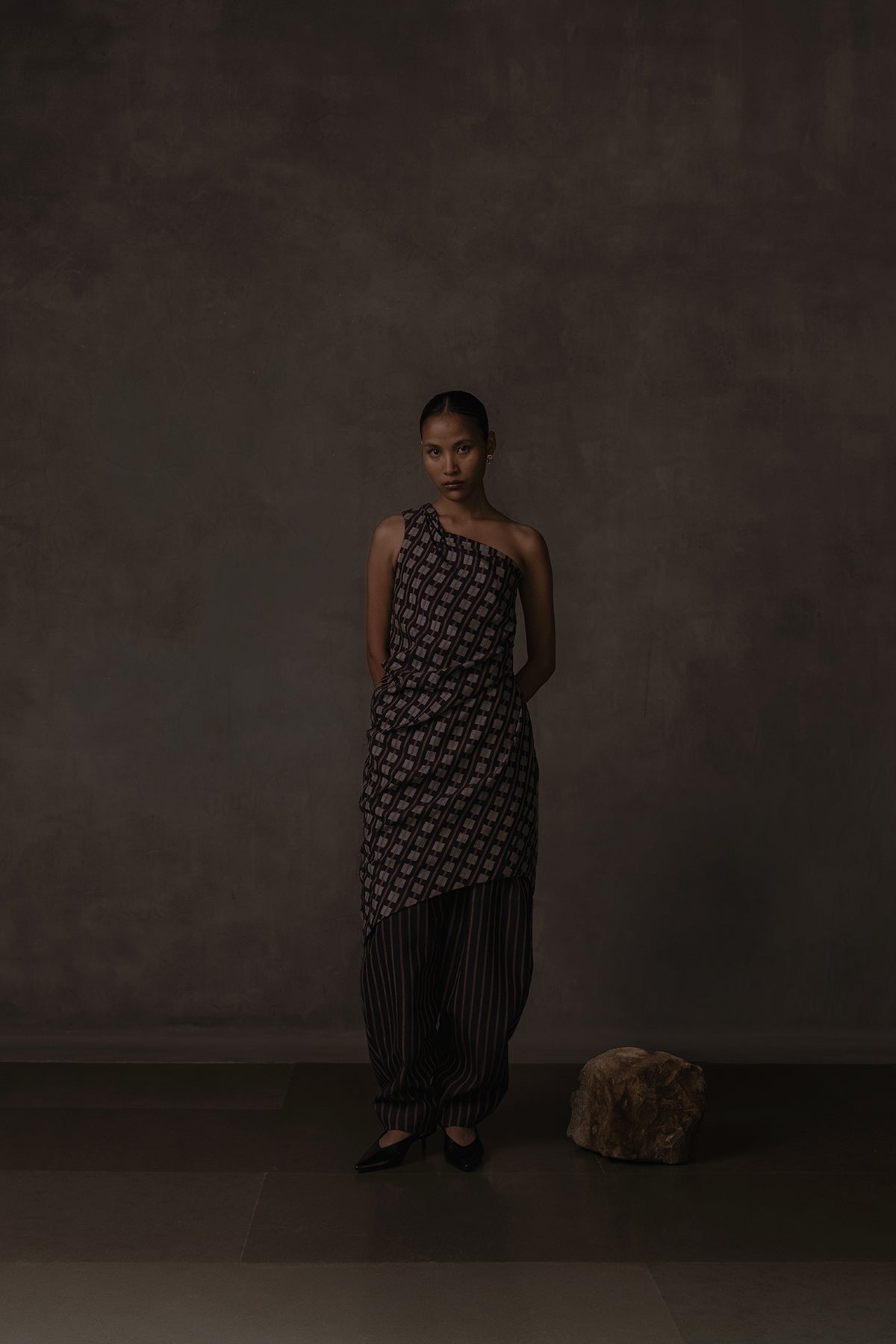 Inspired by Art Deco motifs, the asymmetrical single-shoulder tunic drapes elegantly across one side, featuring geometric cutwork jacquard squares crafted from handspun Khadi cotton and silk, a process that takes approximately 30 hours. Rendered in charcoal, grey, and copper, the textile reflects a quiet interplay of precision and artistry.