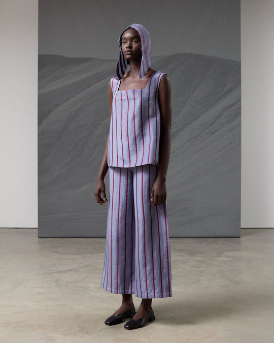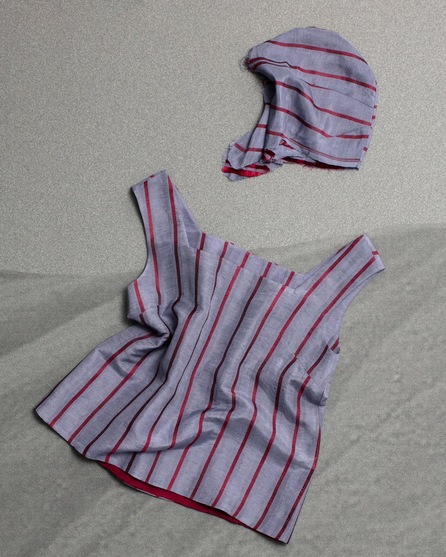 Crafted from a blend of 36% linen, 20% silk, and 44% chenille, this Varanasi-woven fabric took 24 hours to weave. It offers a soft feel and a glossy surface, elevated by raised scarlet texture stripes.