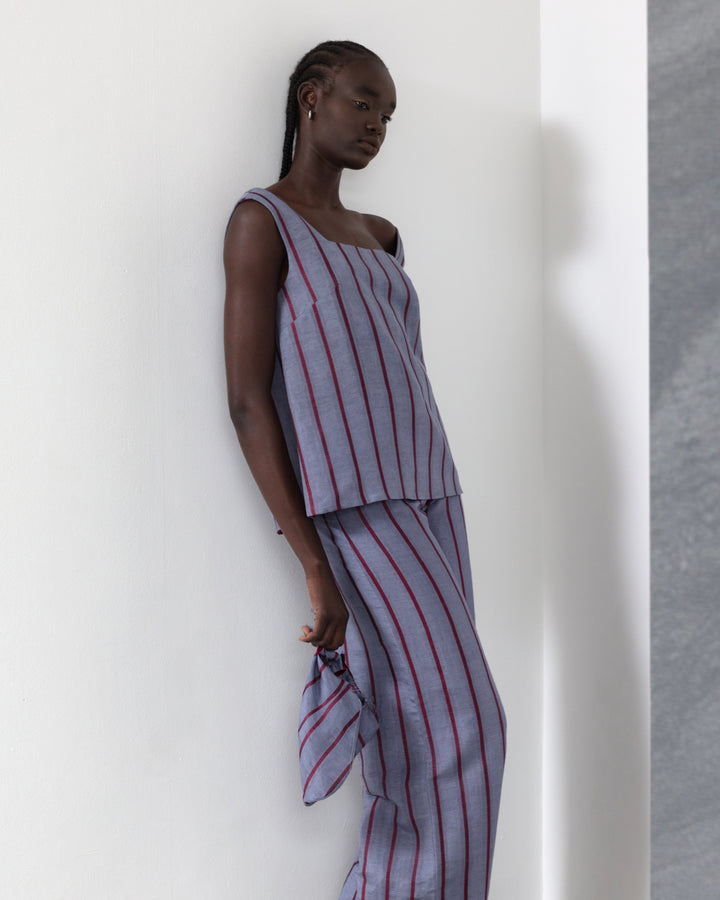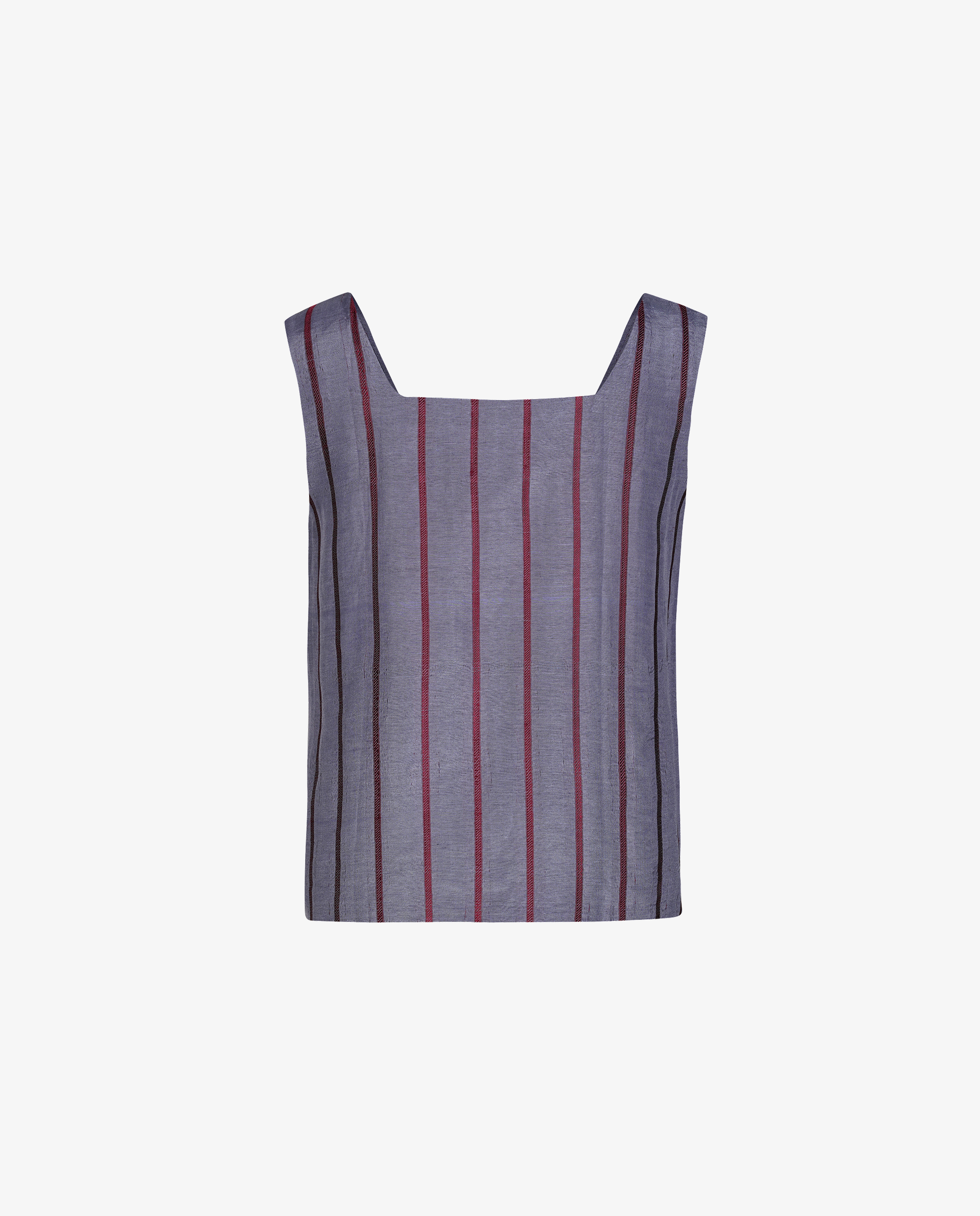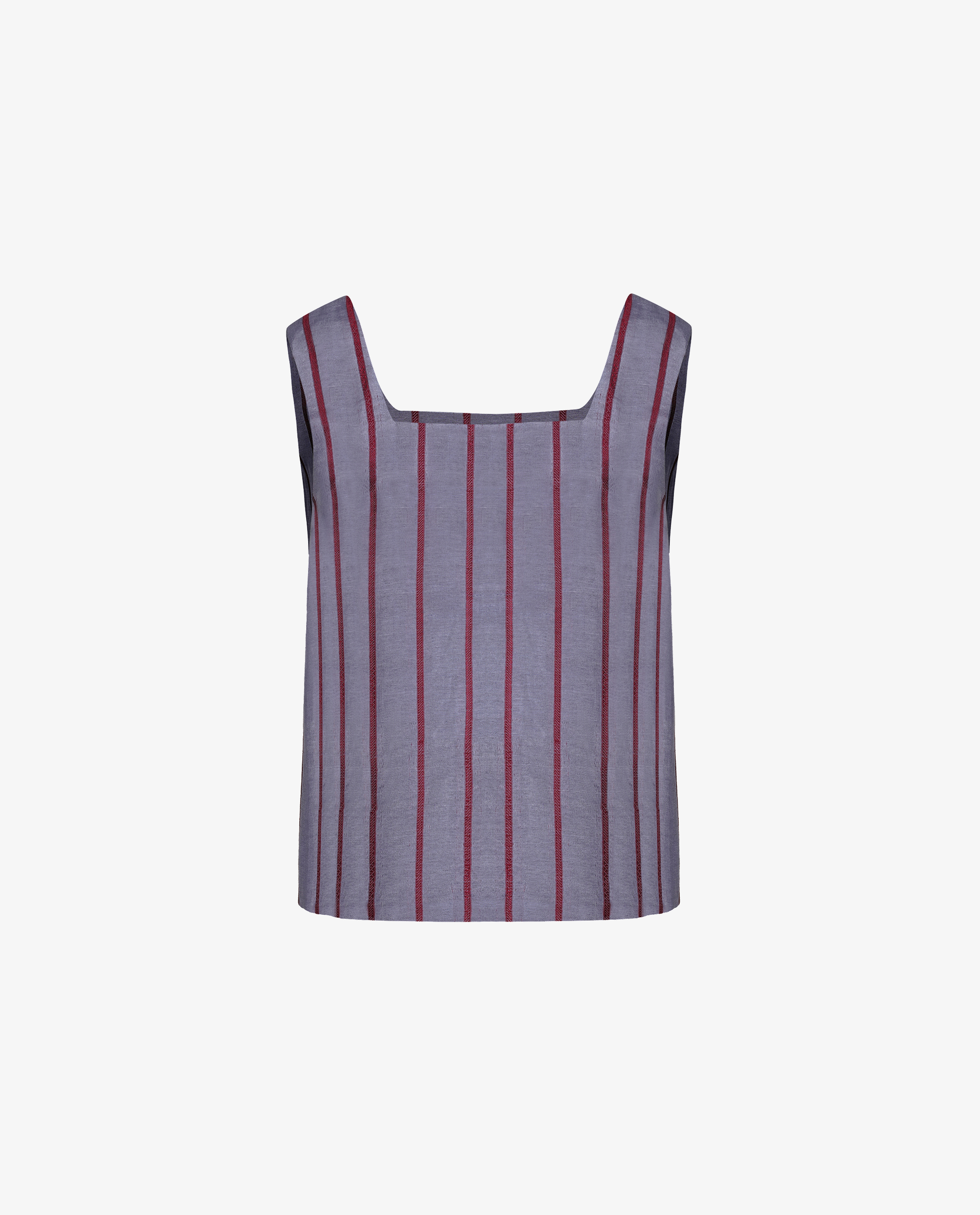 Designed as a sleeveless top, it features a square neckline and sharp, tailored details.