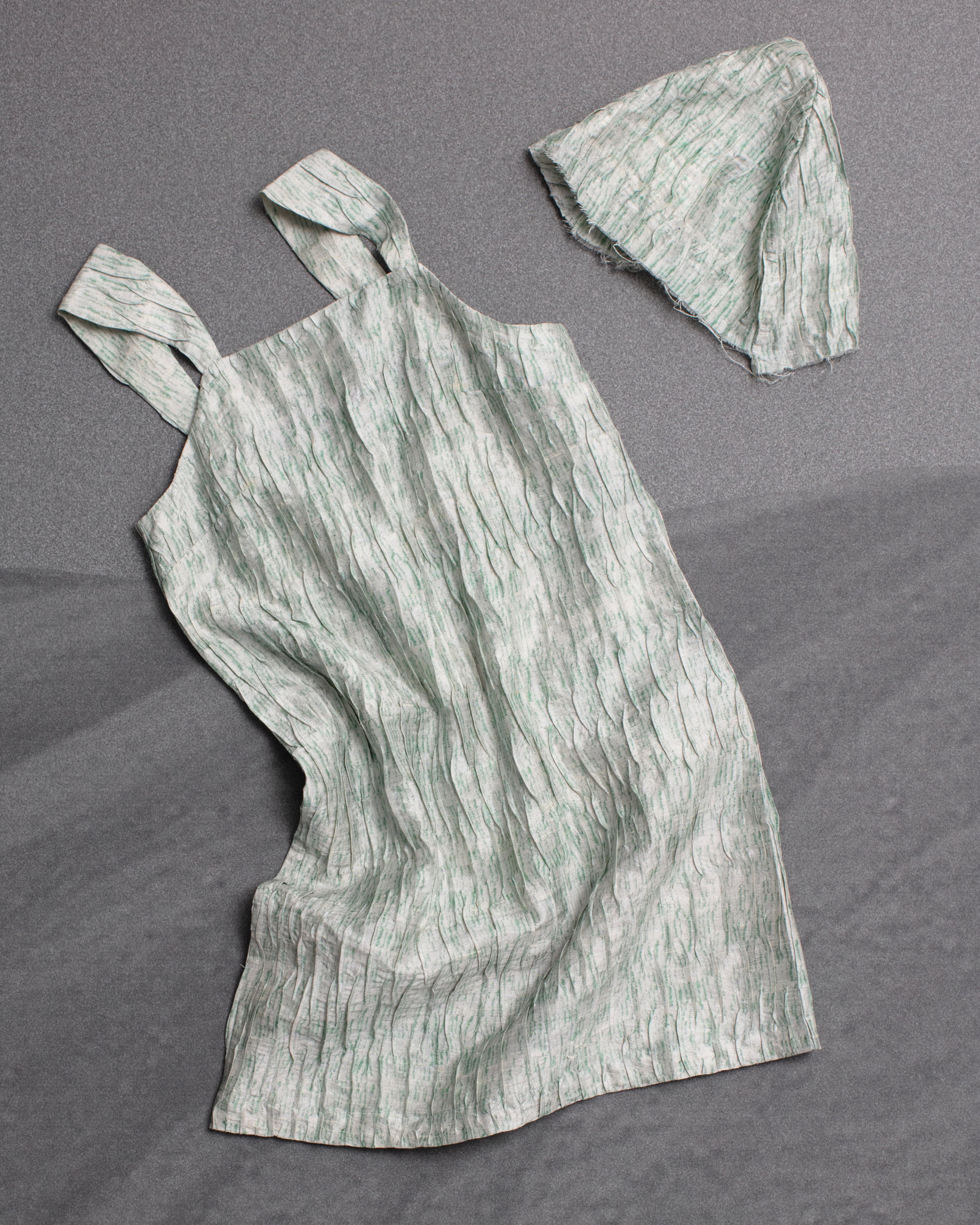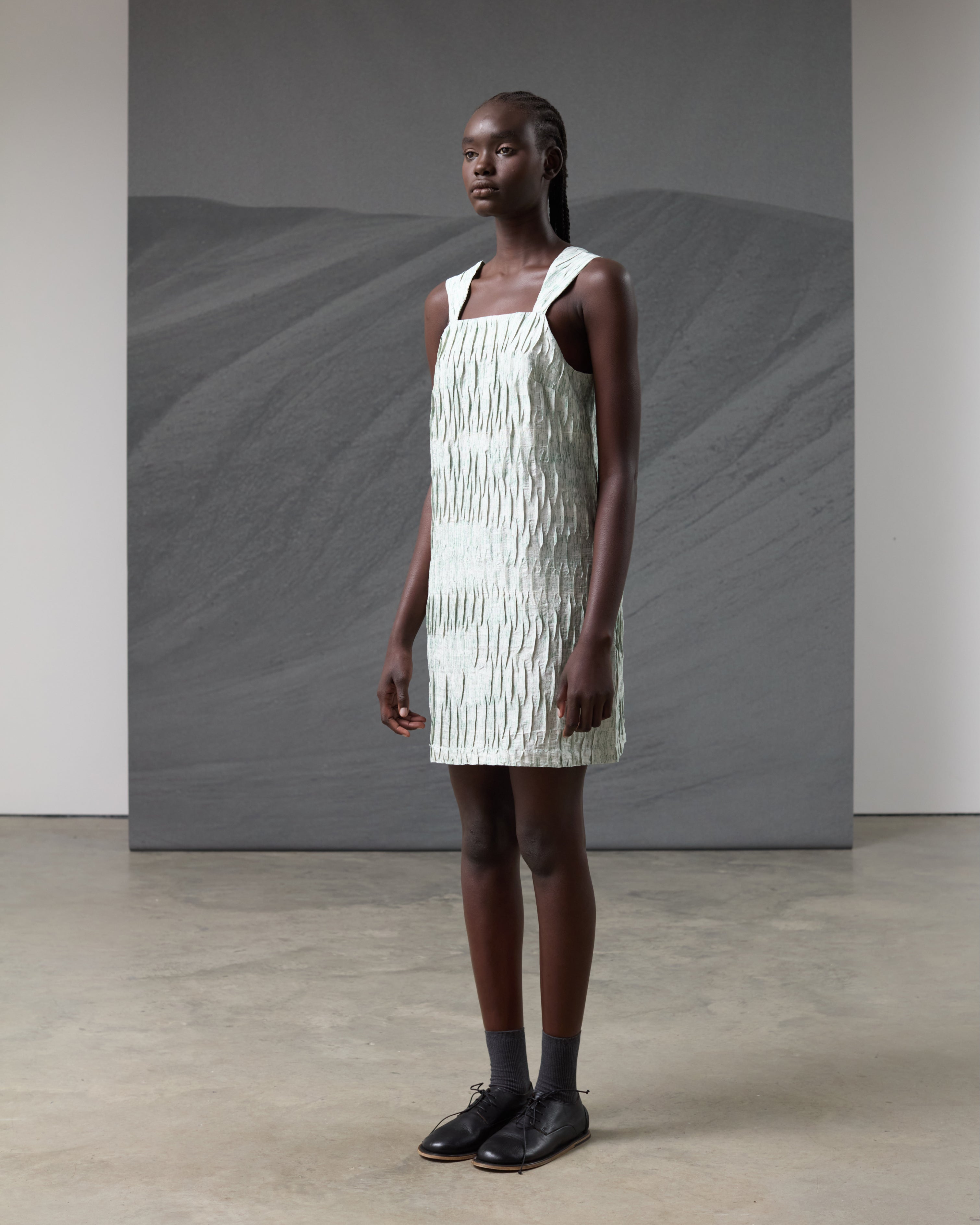 The Copper Dress presents a hemline and structure reminiscent of 1960s classic shift dresses. Handmade raised pintucks that took approximately 16 to 18 hrs add texture, while narrow, tapering shoulder straps and a concealed back zip enhance the bodice.