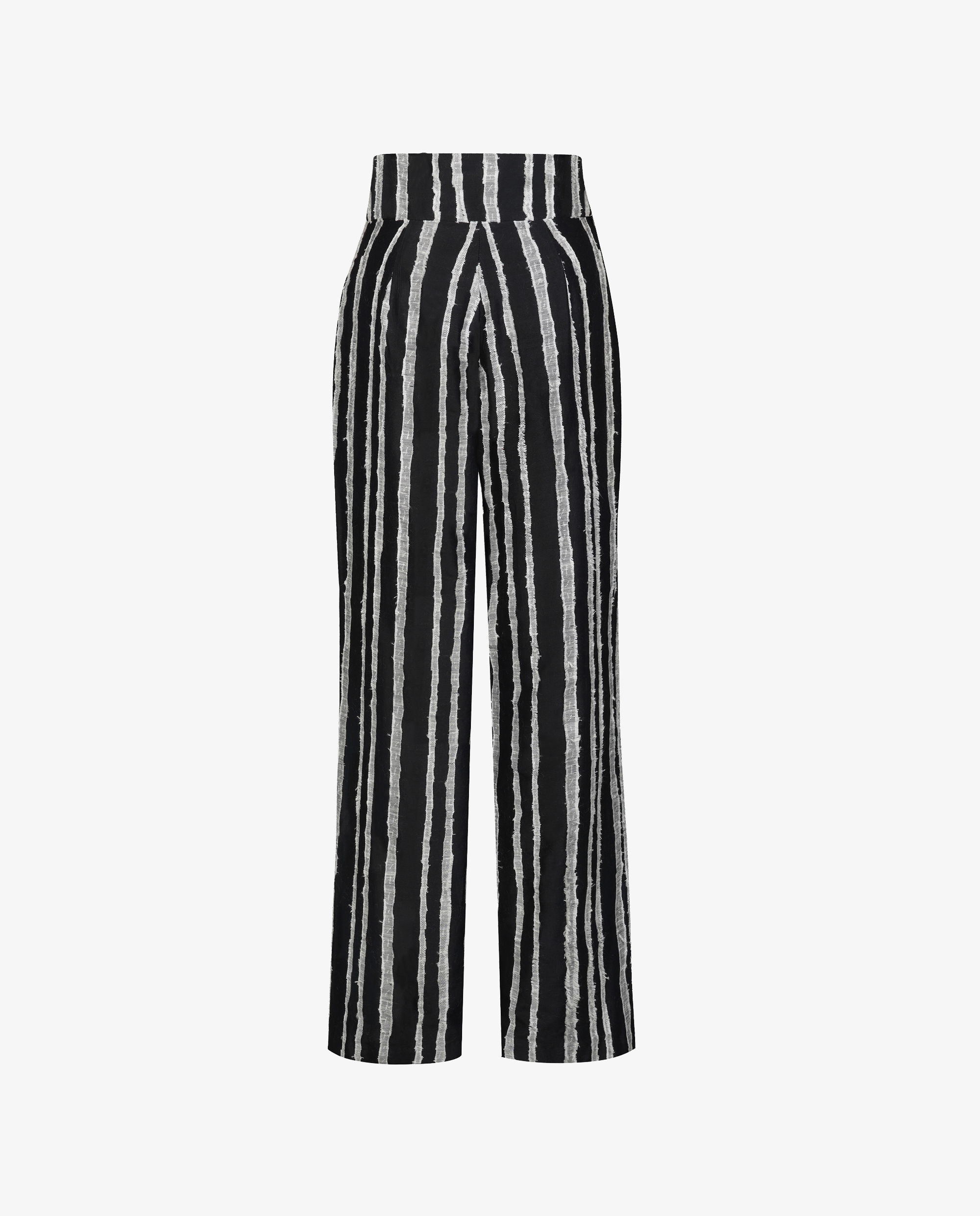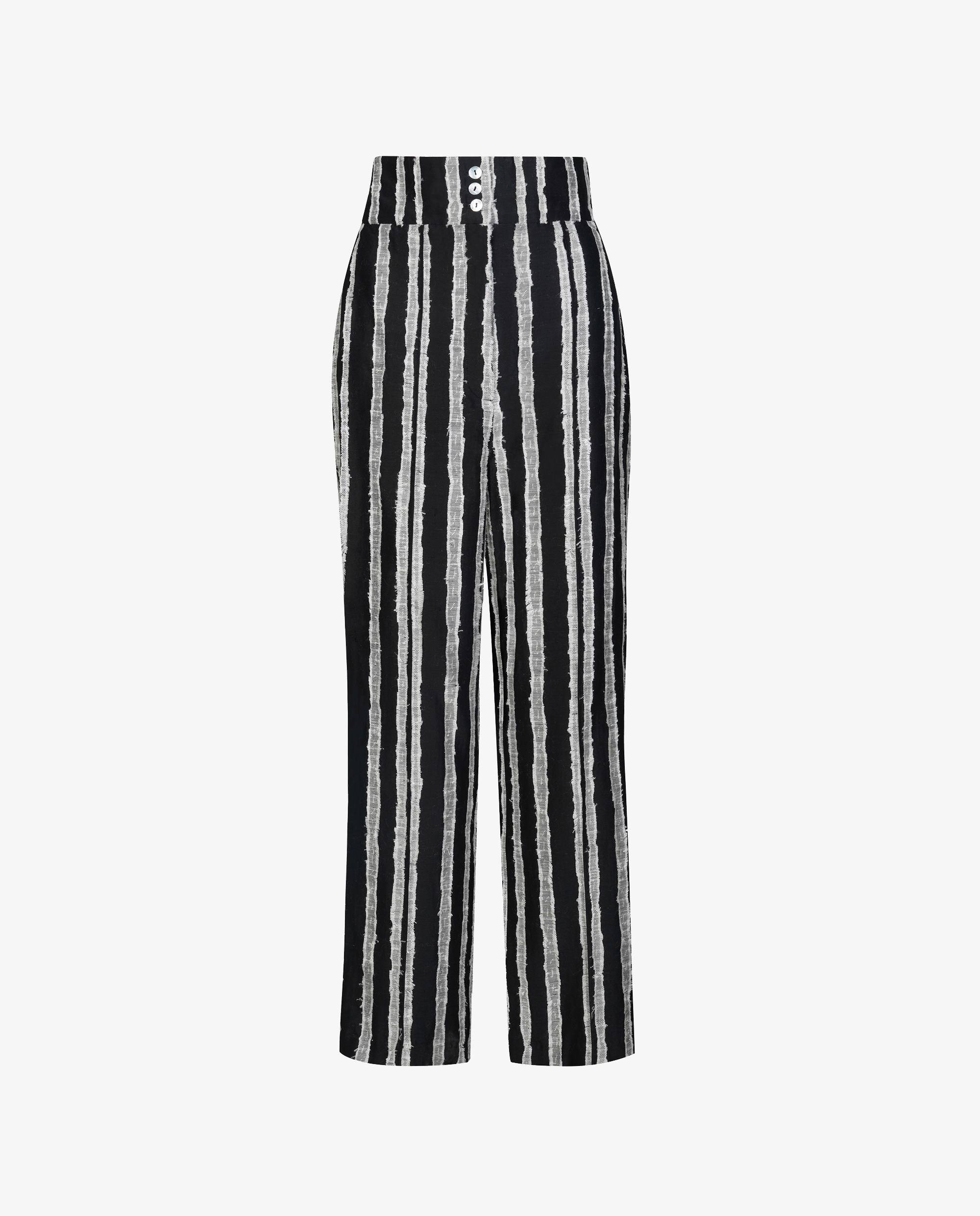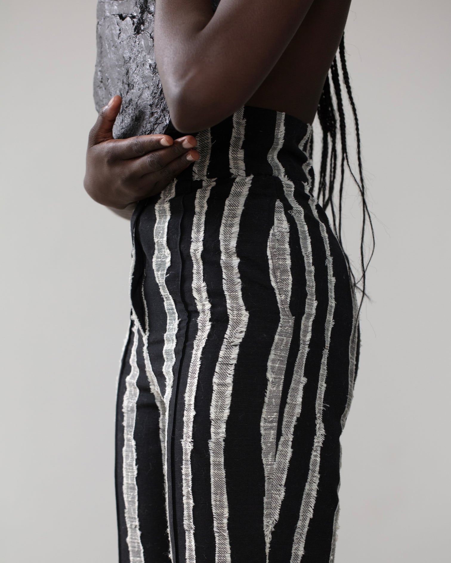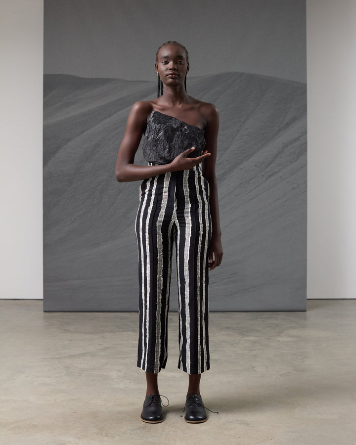 Our ankle-length Charcoal trousers feature handwoven stripes inspired by nature’s rugged textures. Defined front creases, a concealed fly, and carved mother-of-pearl buttons add refined structure.