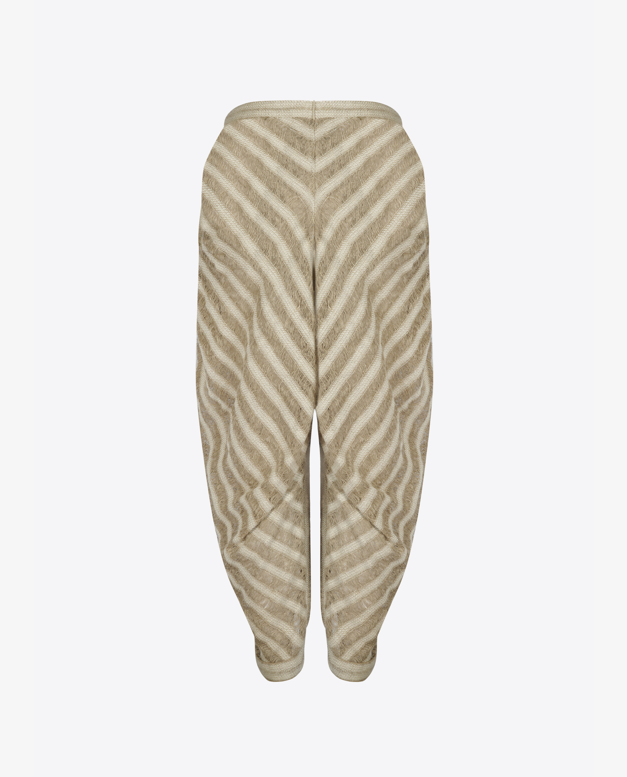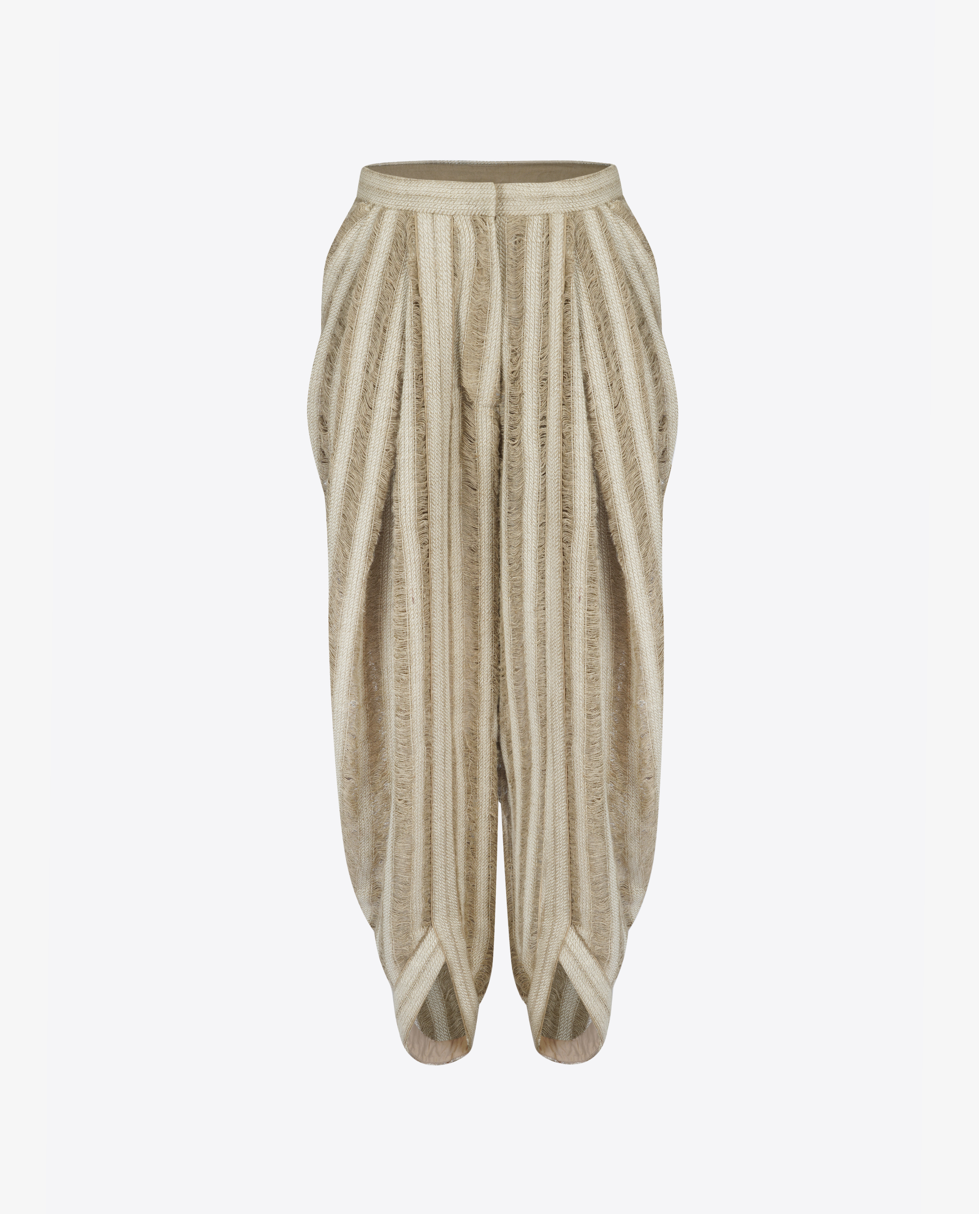 Voluminous dhoti trousers crafted through a specialised differential weaving technique combining cotton and linen to create alternating dense twill and open-weave stripes.