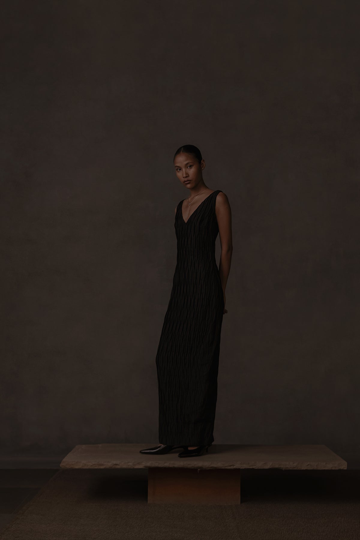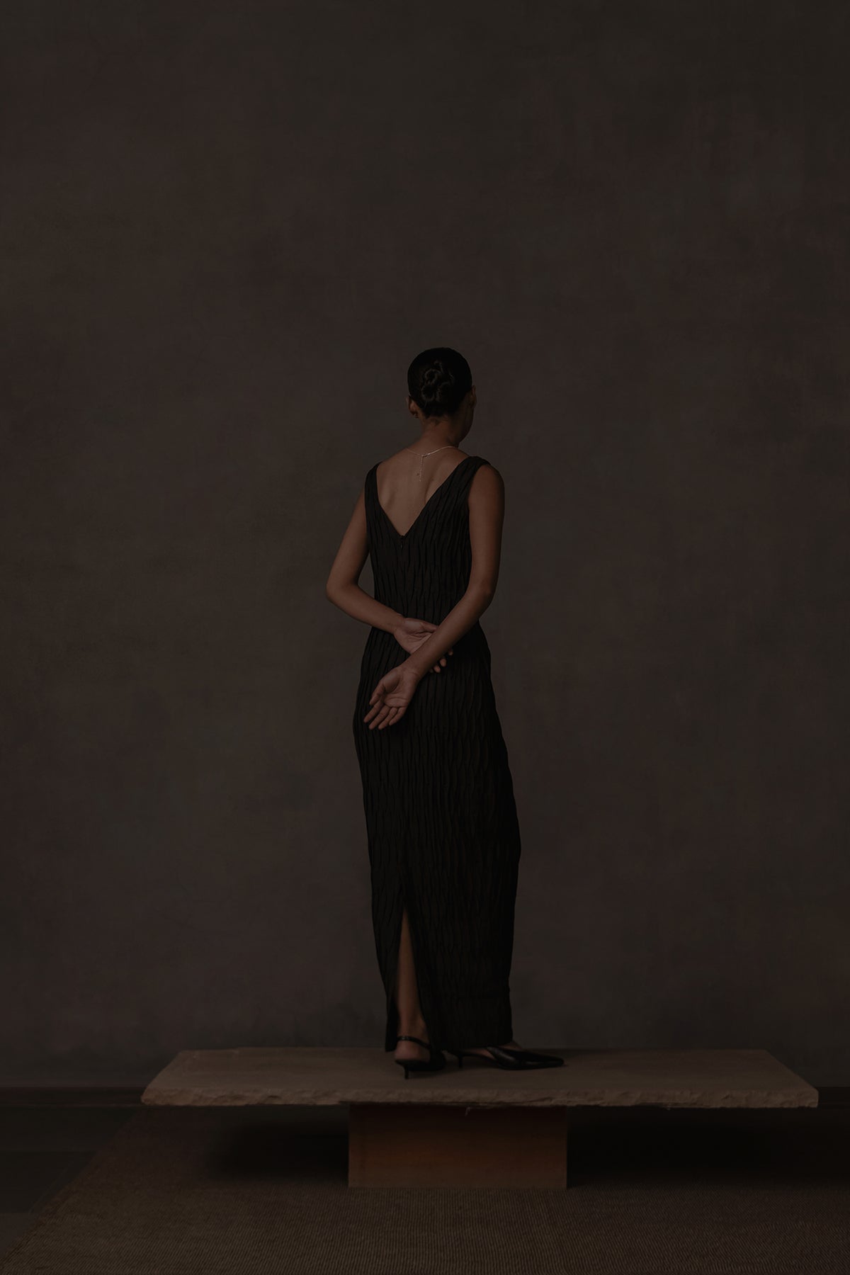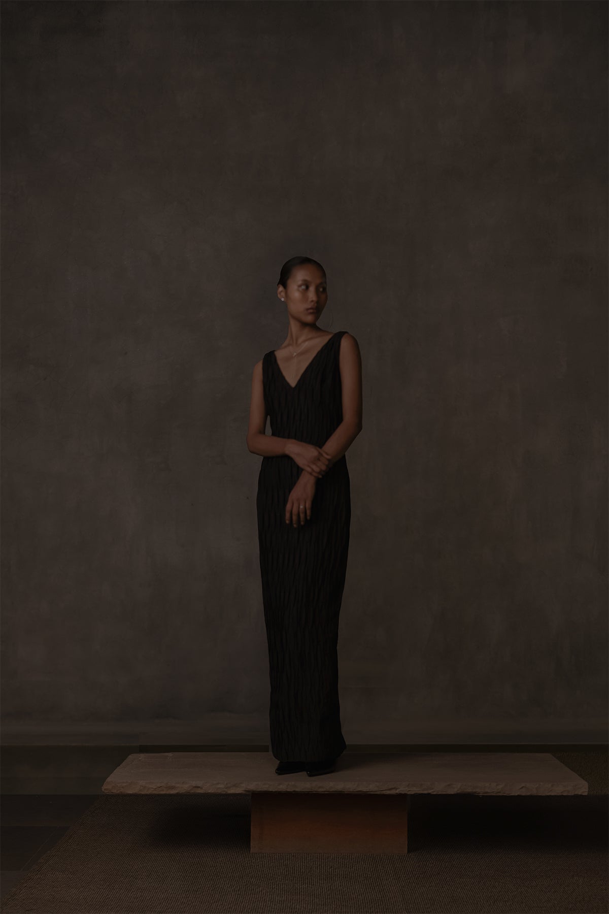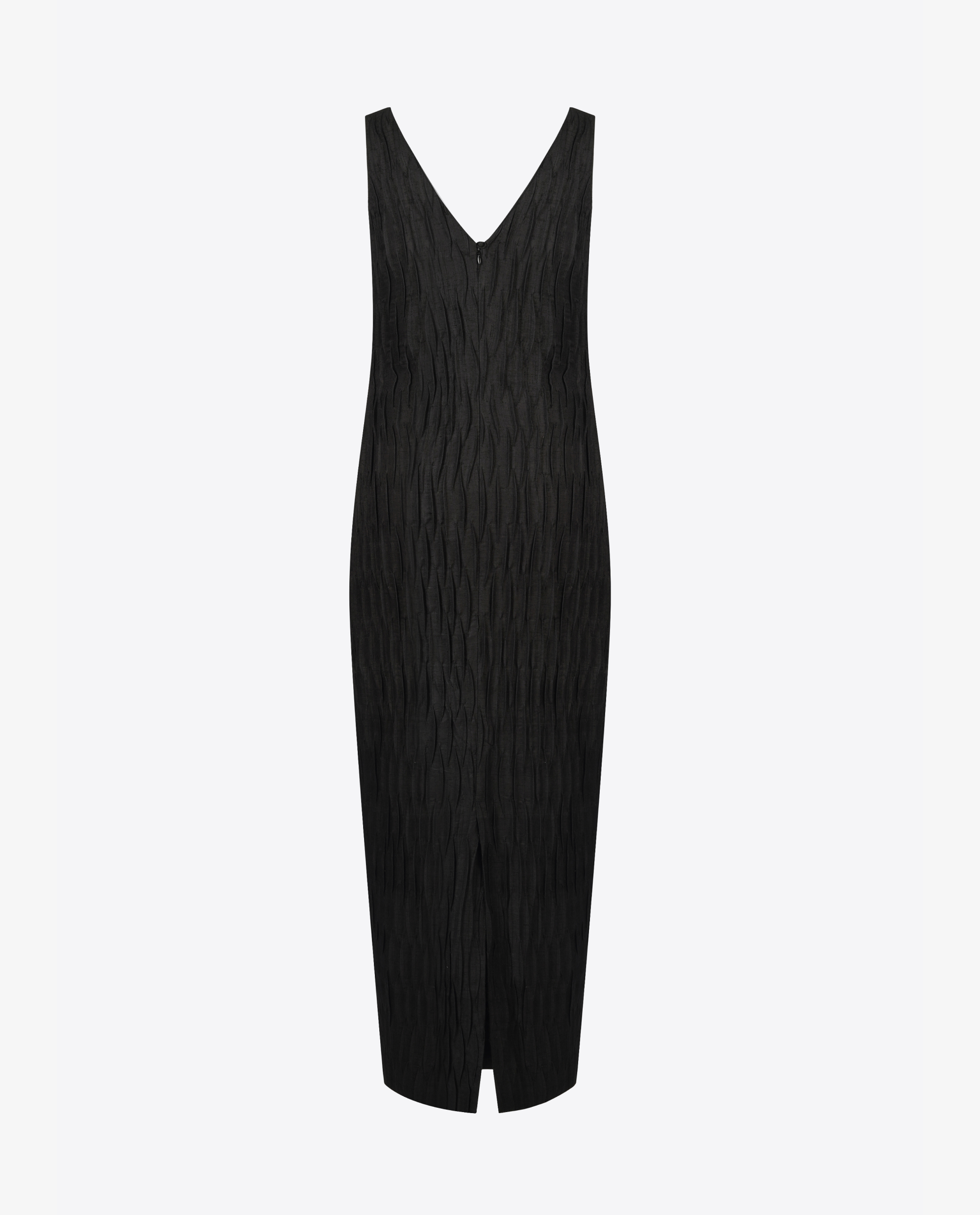 Long and slender, the dress reveals subtle textural depth through handmade corrugated pleated folds that run its full length. The neckline dips into a graceful V at both front and back, lending a refined, understated allure, while a concealed back zipper and slit ensure ease of movement.