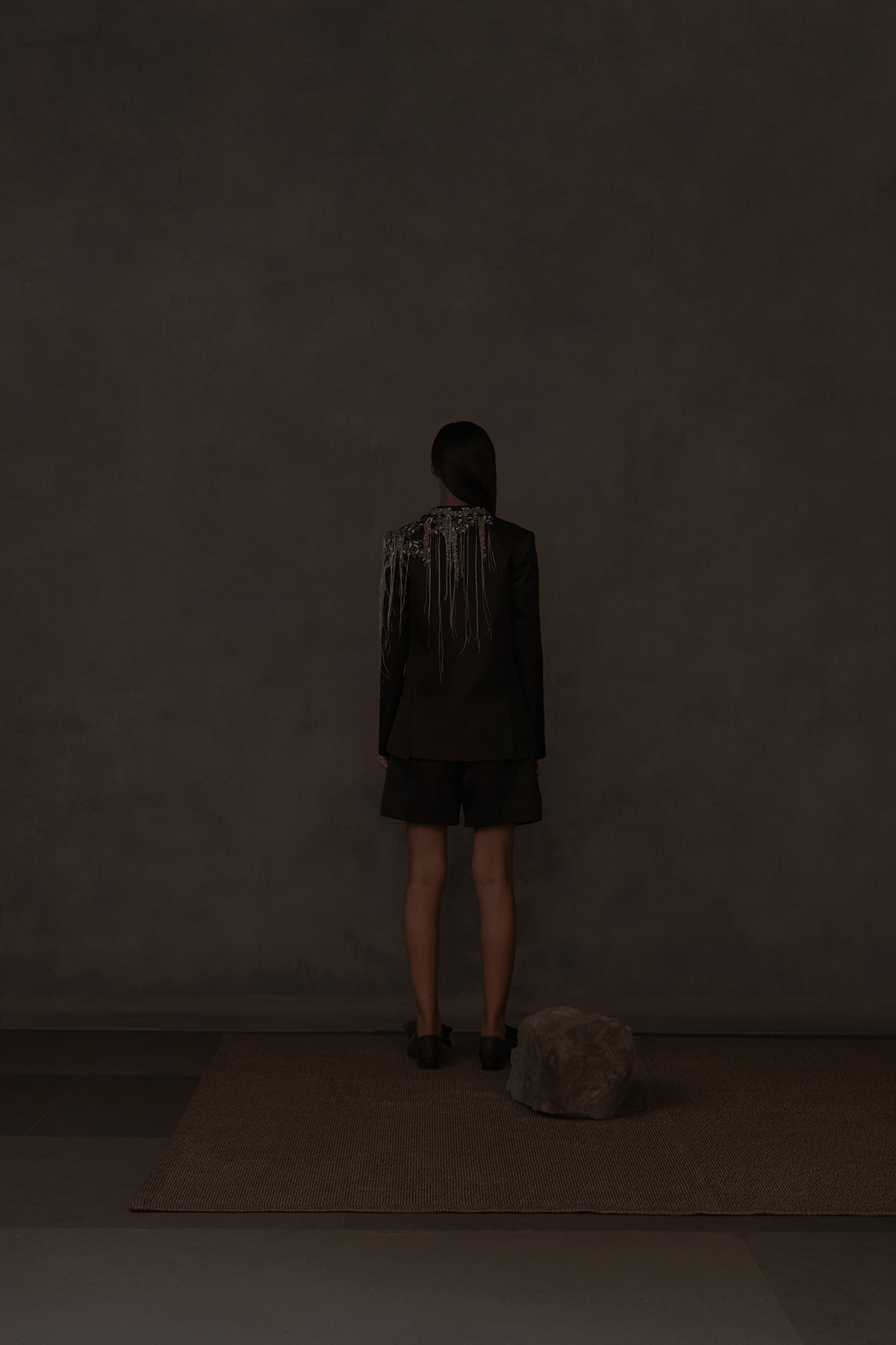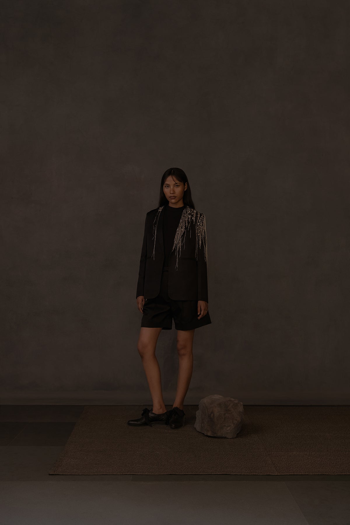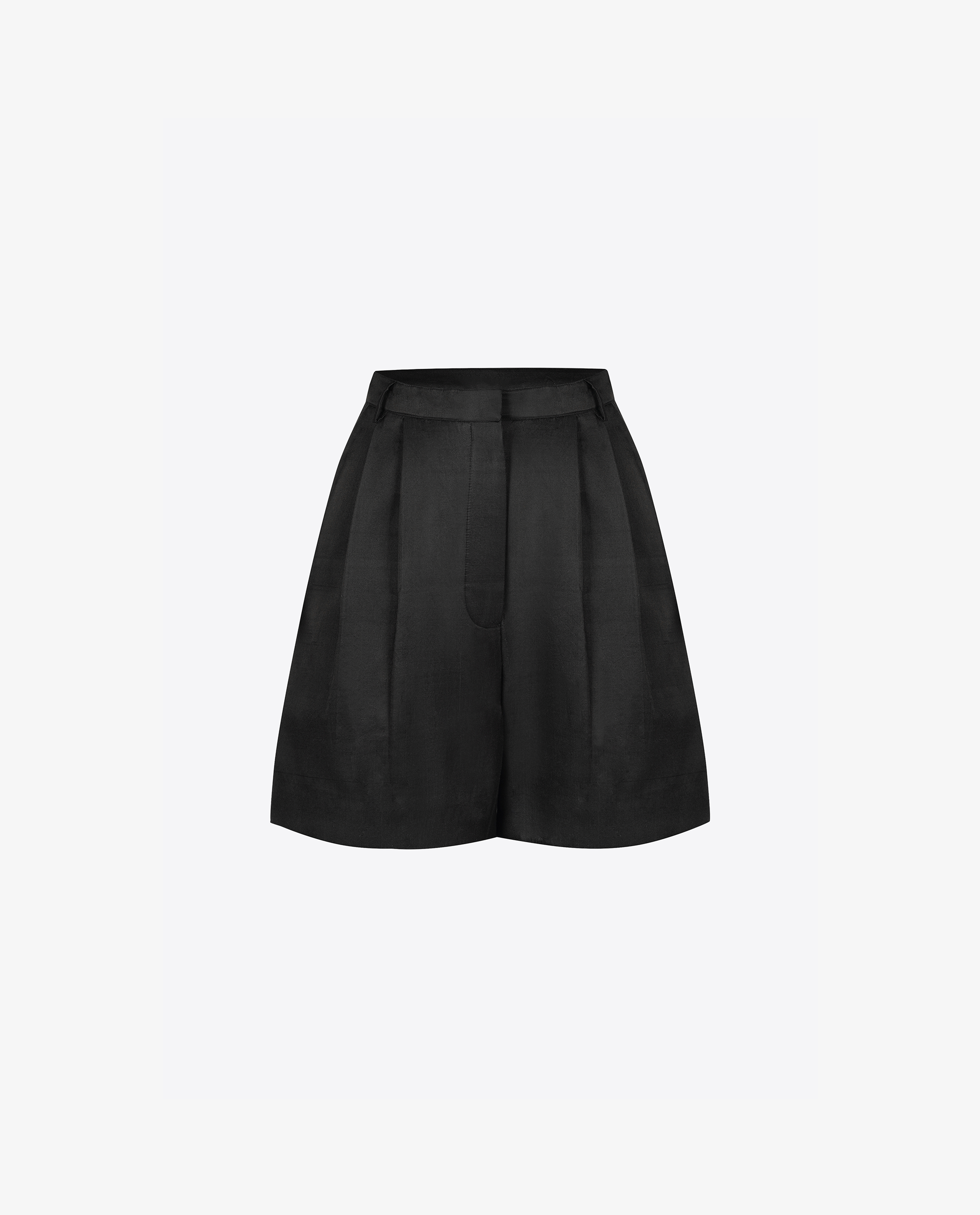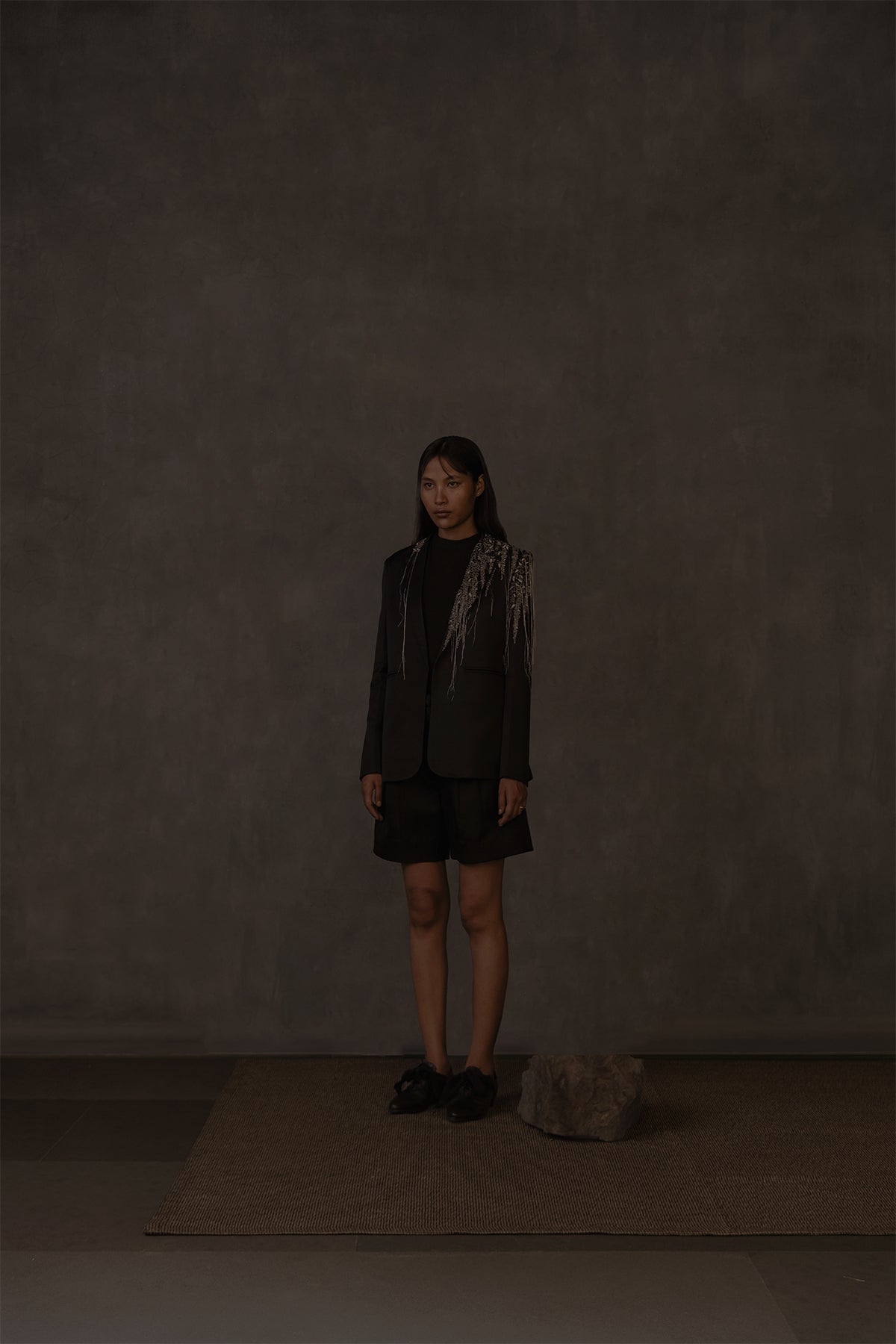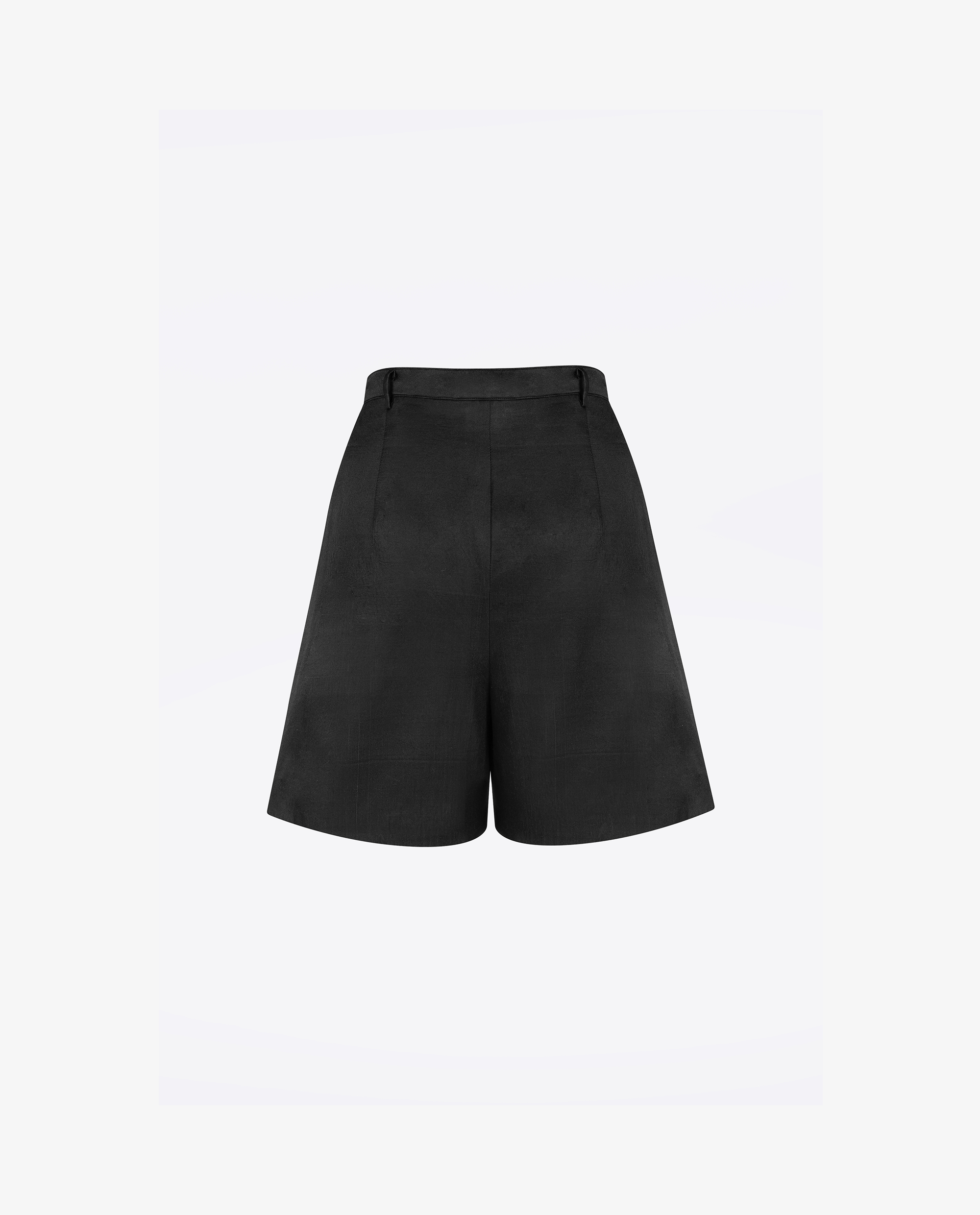Tailored for a structured, sharp fit, these boxy shorts feature two front pleats, side pockets, a front fly opening, and a belt section with loops. Handwoven in Varanasi from soft Mashru and lined with Bemberg, they pair perfectly with the Midnight Resham Blazer for a refined, cohesive look.