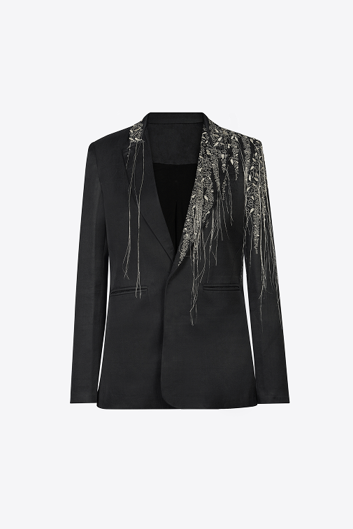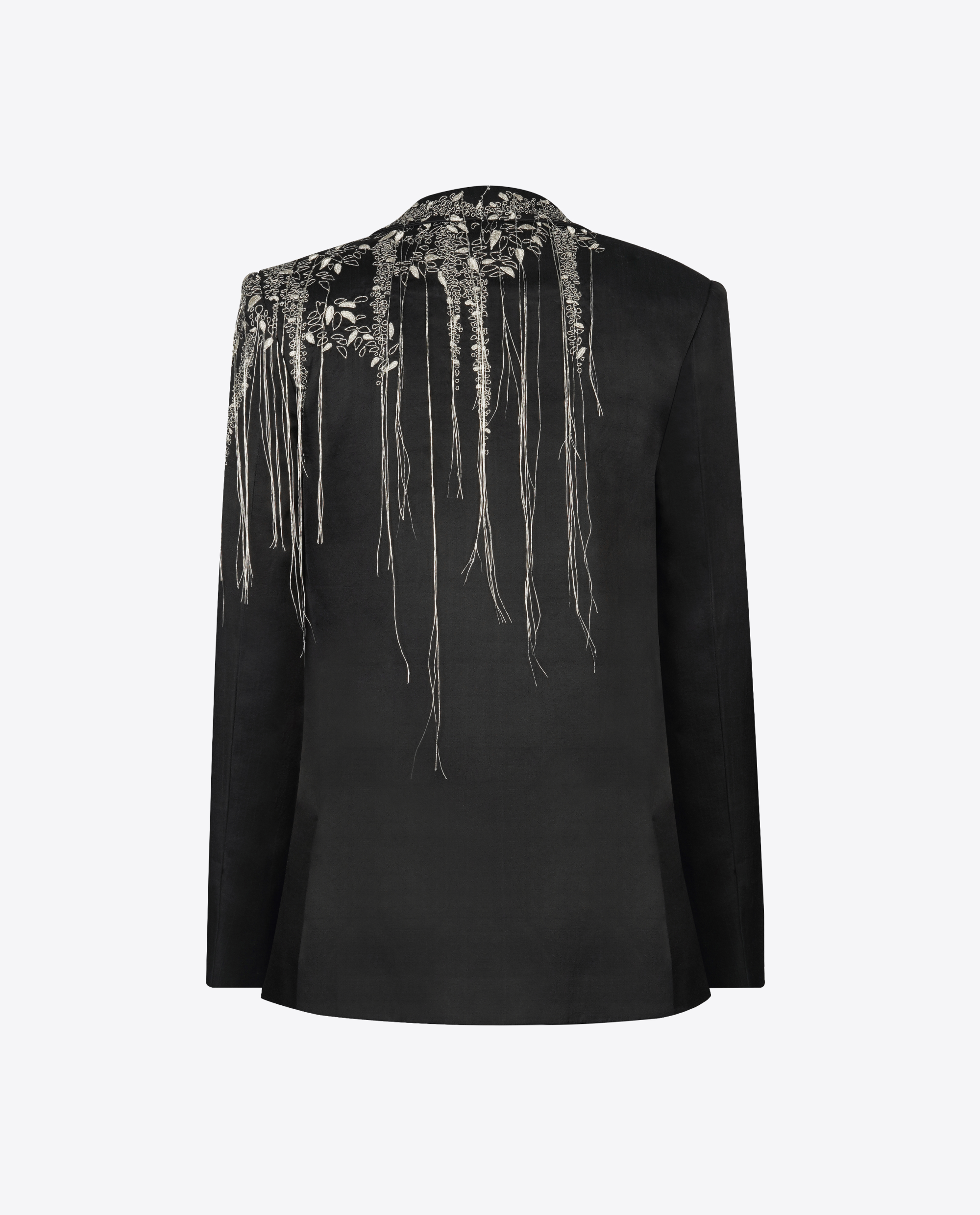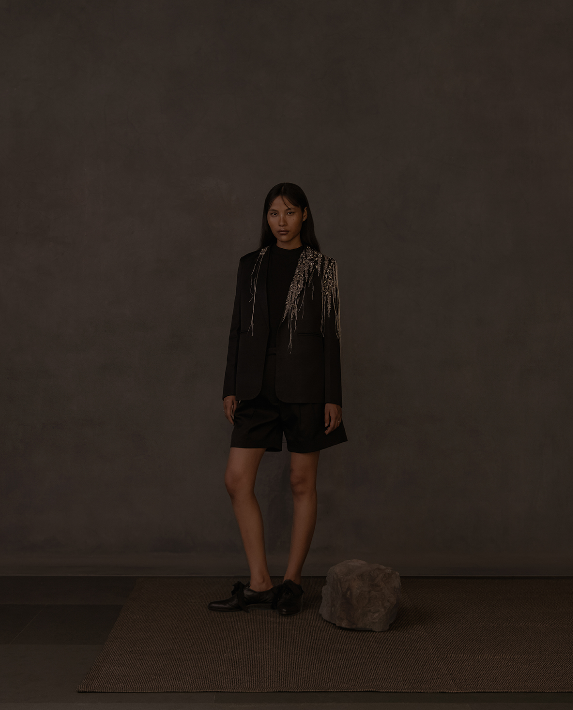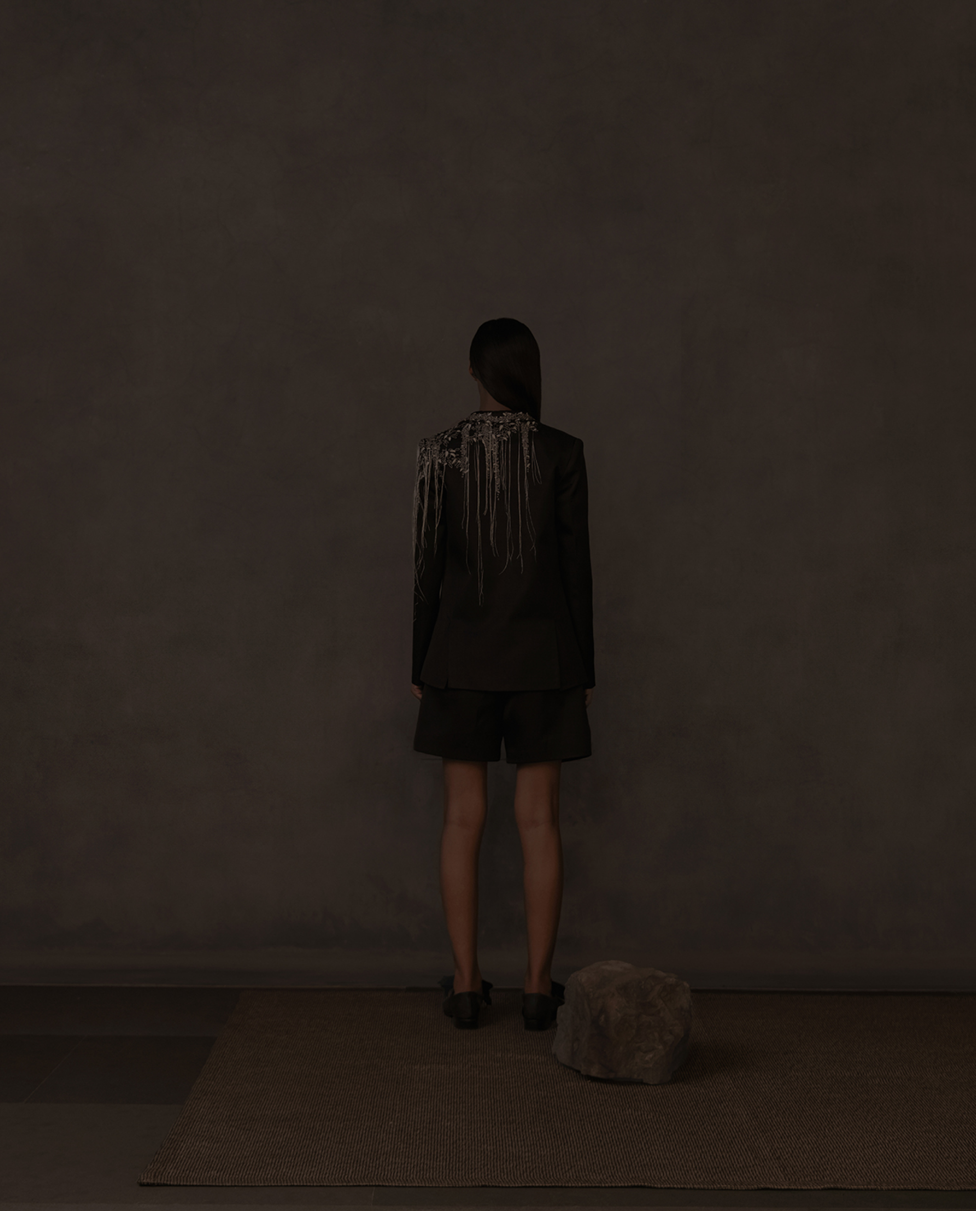 A structured blazer adorned with abstract foliage embroidery along one shoulder and part of the lapel, rendered in meticulous gold zari and suspended resham yarns reminiscent of weeping willow branches. Crafted from 35 hours handwoven Mashru in Varanasi and lined with soft Bemberg, the piece features two welt pockets and embodies couture precision and artisanal elegance. It can be worn along our Midnight Pleated Shorts.