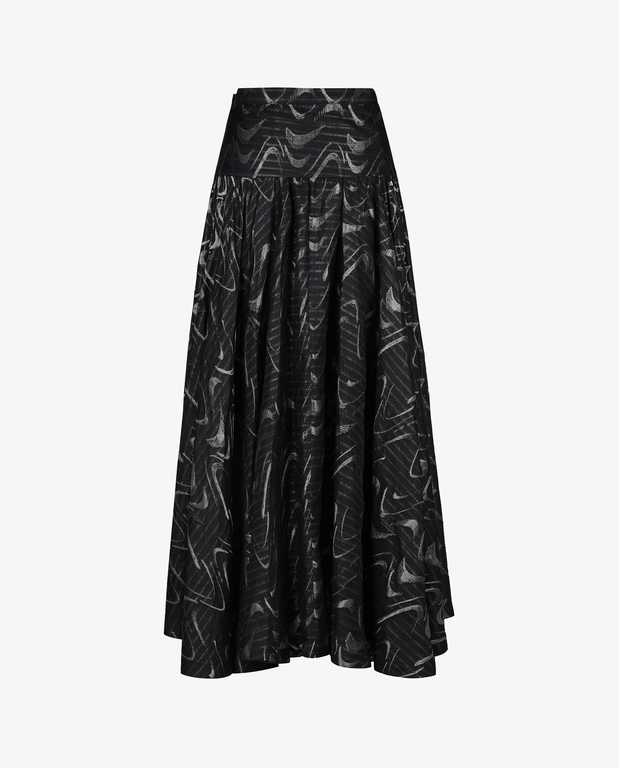 The full-length skirt has a hem rising slightly at the front and back center. It boasts multiple drape folds, a narrow belt, and a concealed zip.