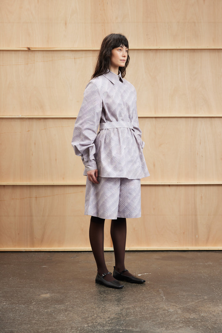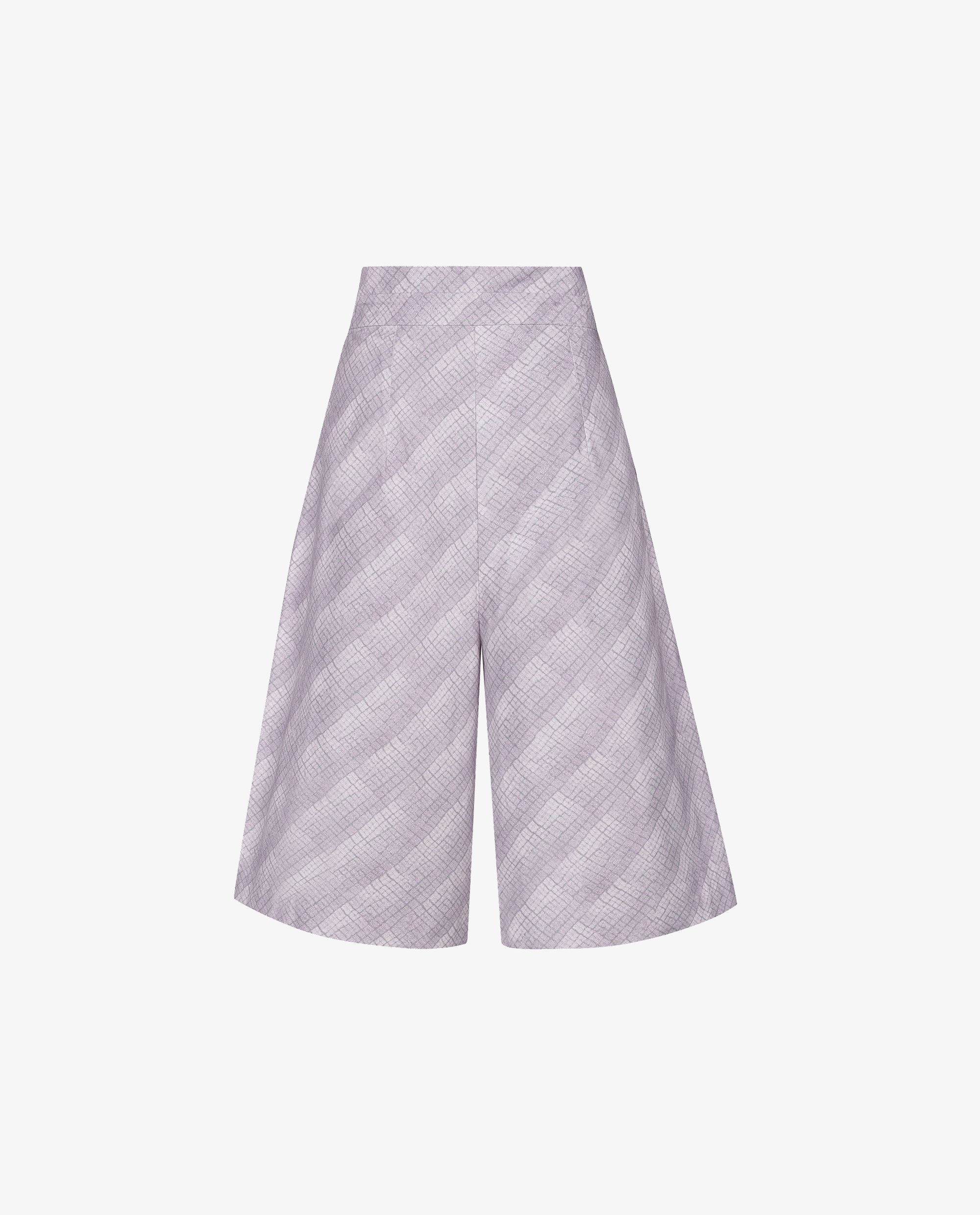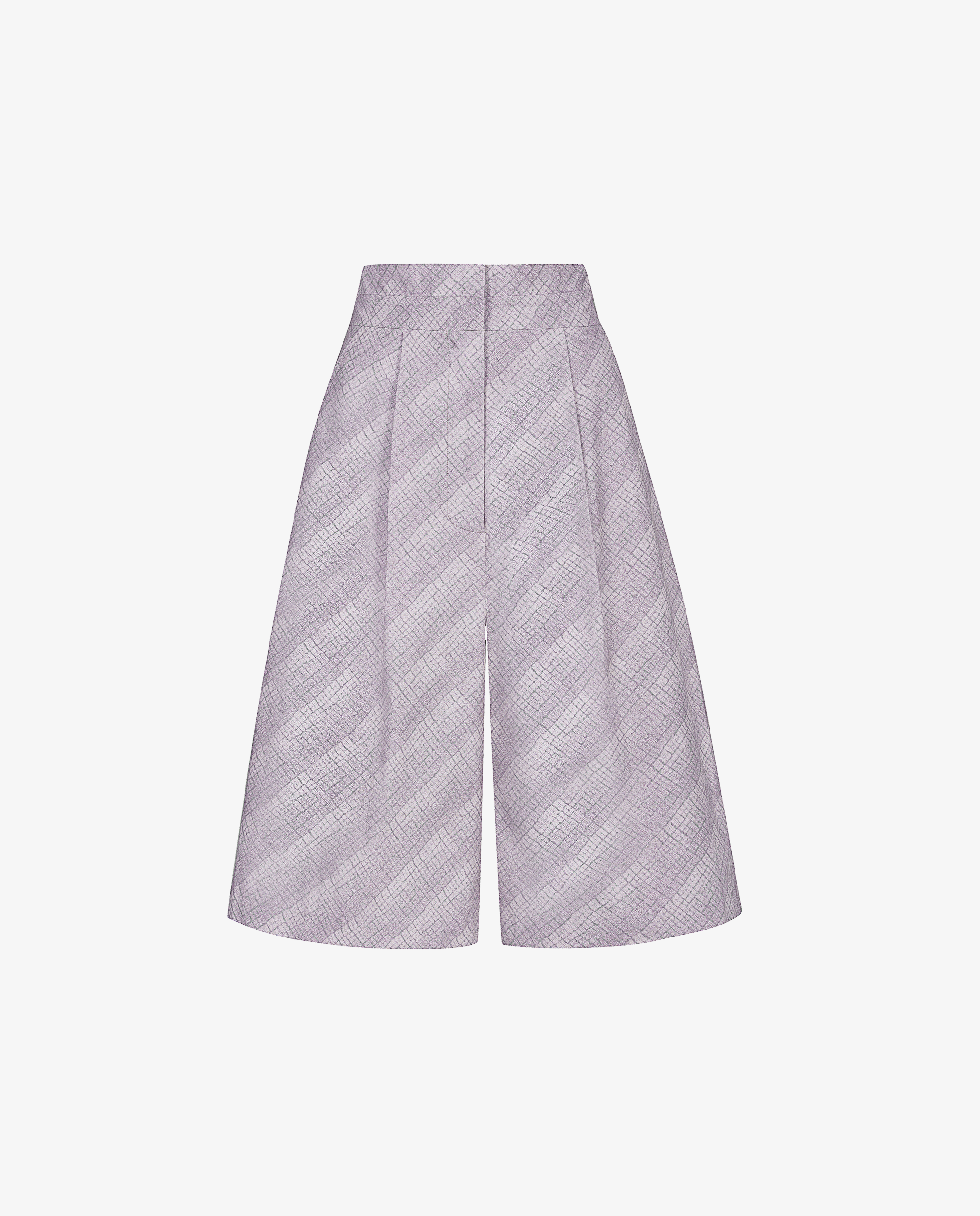 These boxy-fit shorts reach almost to the knee, as shown by our 5'11" model in size 8. They feature neatly tucked-in knife pleats, a concealed zipper fly, and deep side pockets. Made from 100% cotton poplin, the fabric has a smooth, lustrous surface with an organic textured digital print in lavender and grey. These high-waist shorts are a laborious testament to the craftsmanship of 16 artisans and 5 designers, realized in 86 hours.