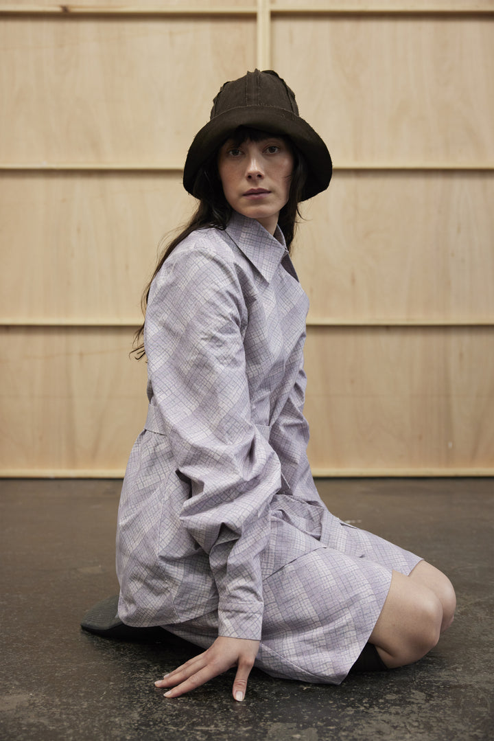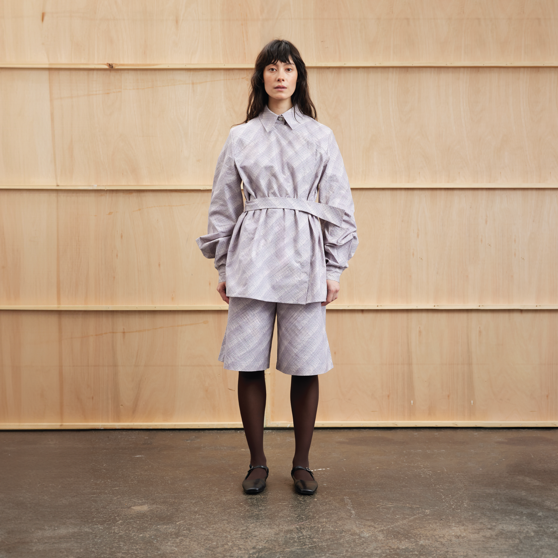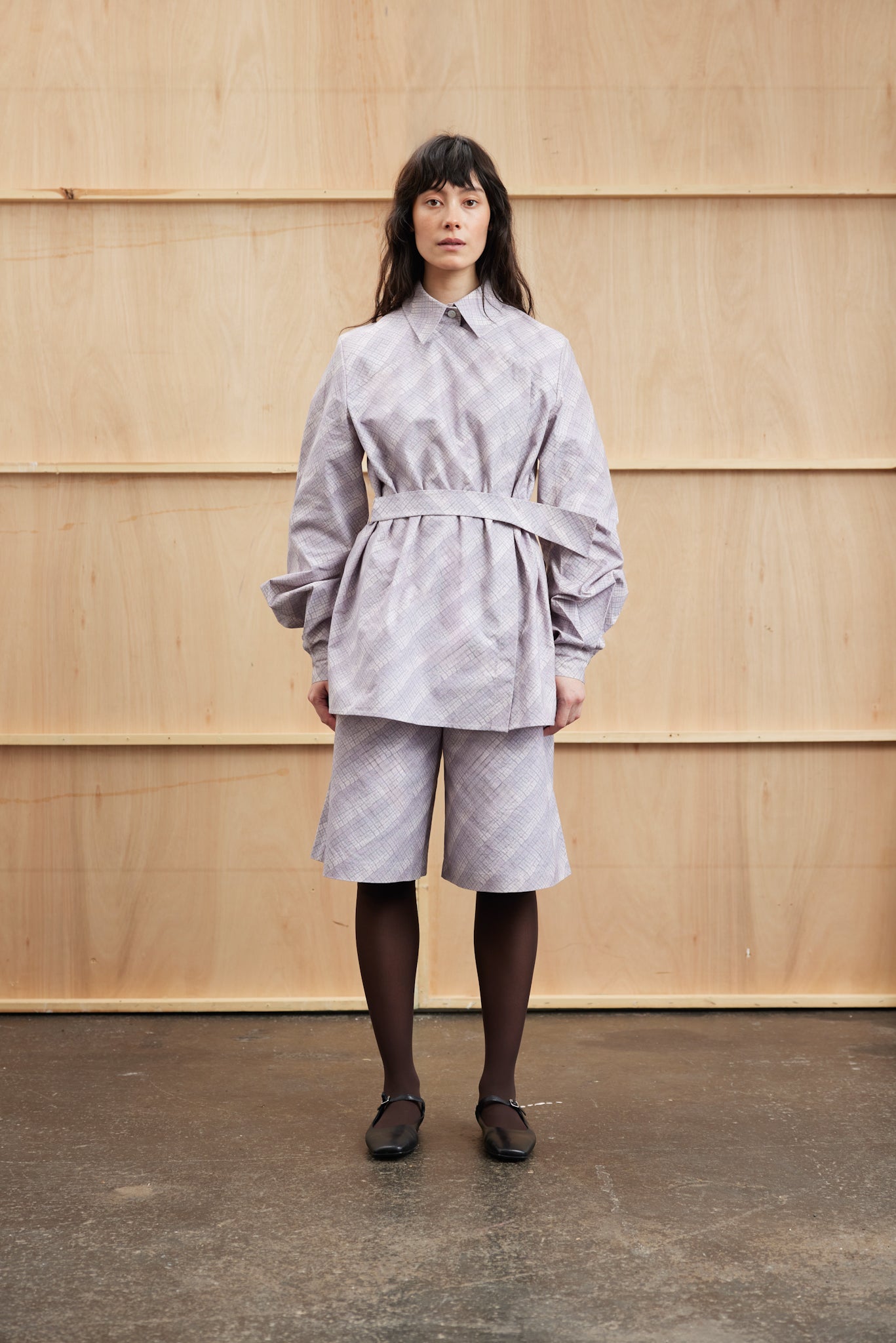 These boxy-fit shorts reach almost to the knee, as shown by our 5'11" model in size 8. They feature neatly tucked-in knife pleats, a concealed zipper fly, and deep side pockets. Made from 100% cotton poplin, the fabric has a smooth, lustrous surface with an organic textured digital print in lavender and grey. These high-waist shorts are a laborious testament to the craftsmanship of 16 artisans and 5 designers, realized in 86 hours.