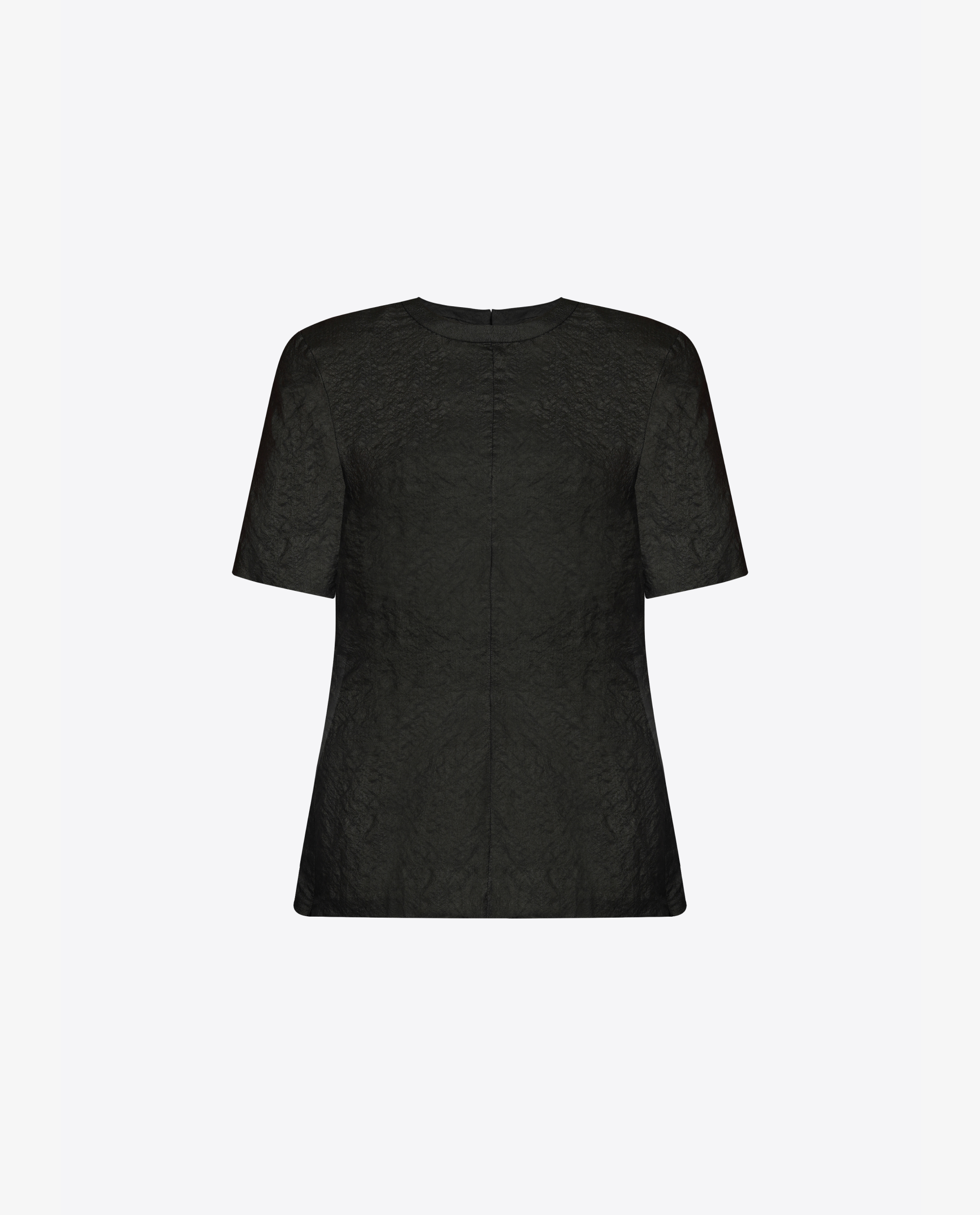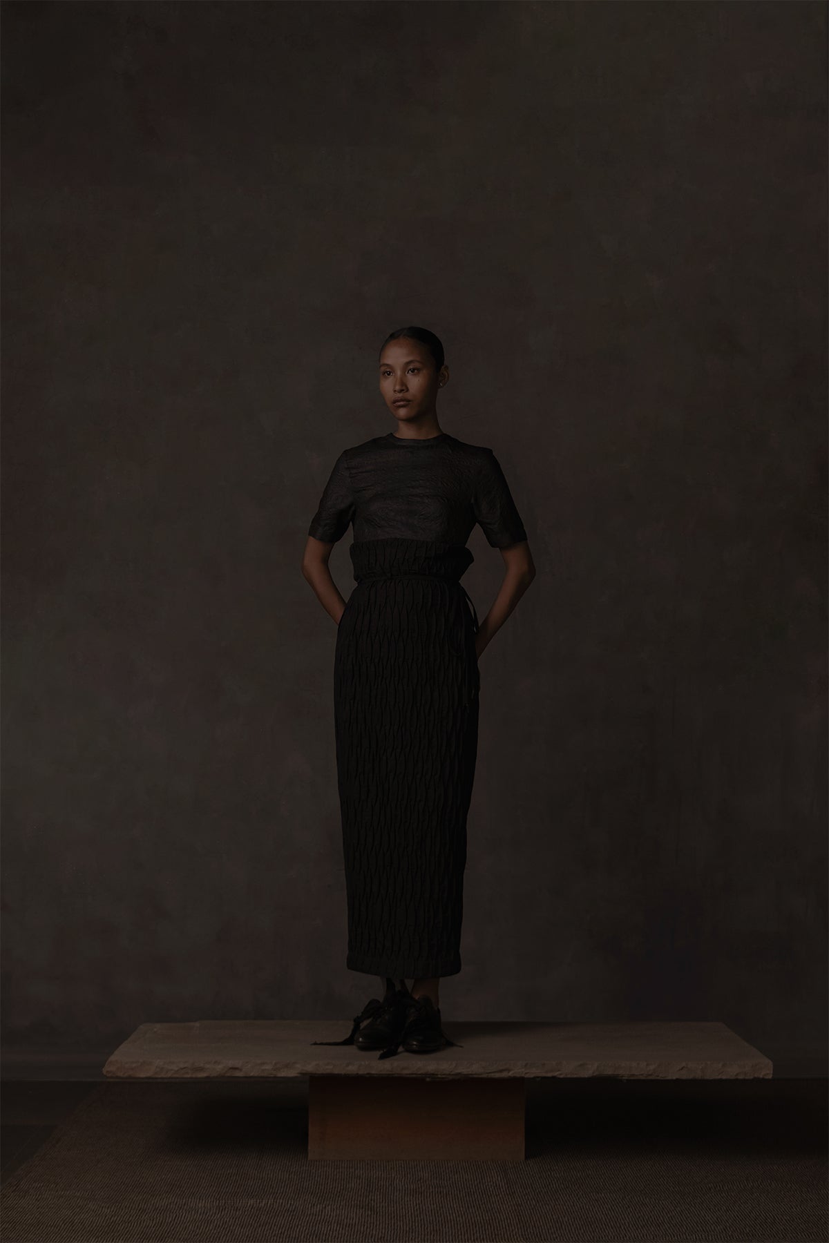 Handwoven over 6 hours in Tussar Silk, the top carries a gentle seersucker texture that lends dimension to its charcoal black surface. The crew neckline fastens at the back with handcrafted buttons. Designed for an easy, relaxed fit.