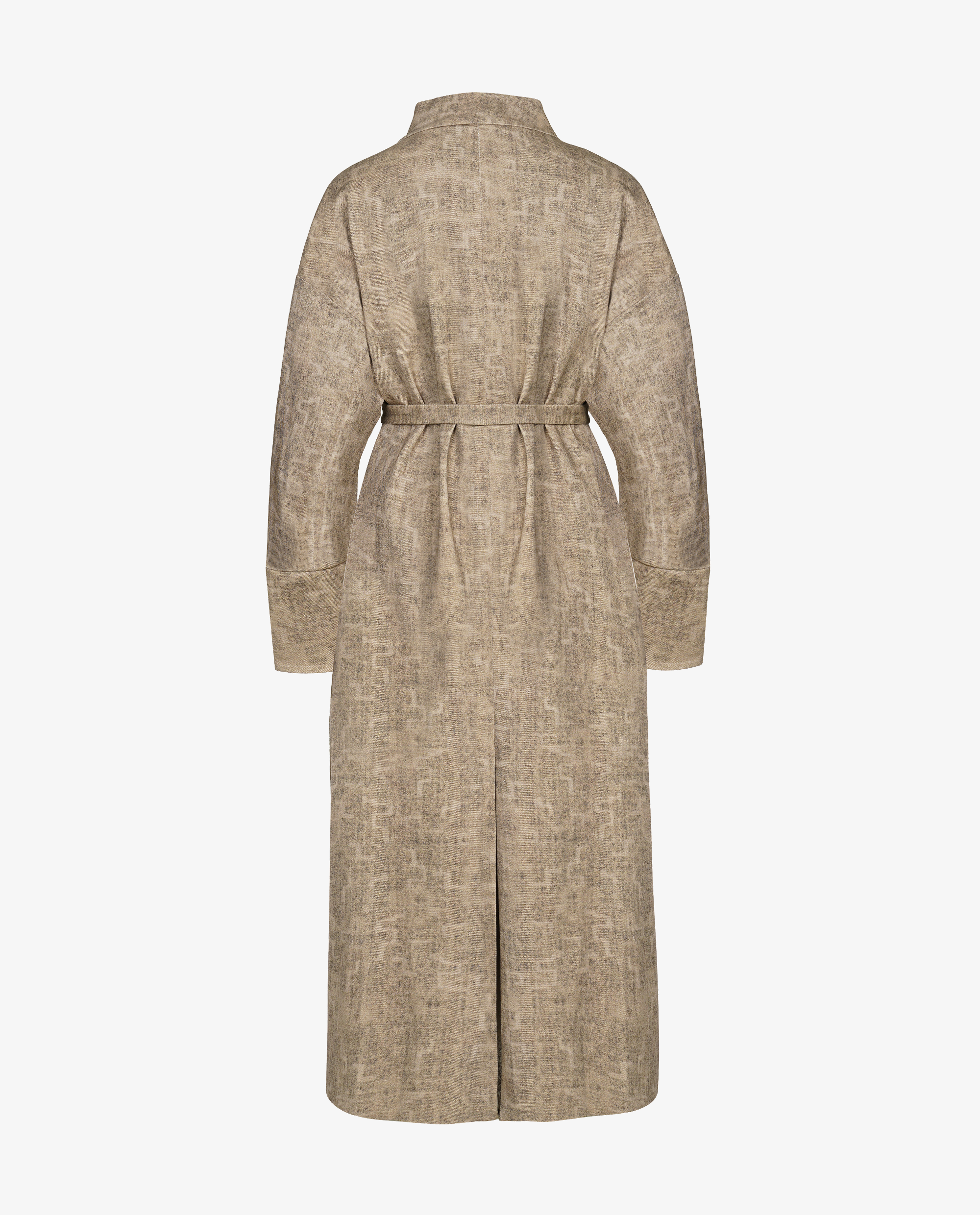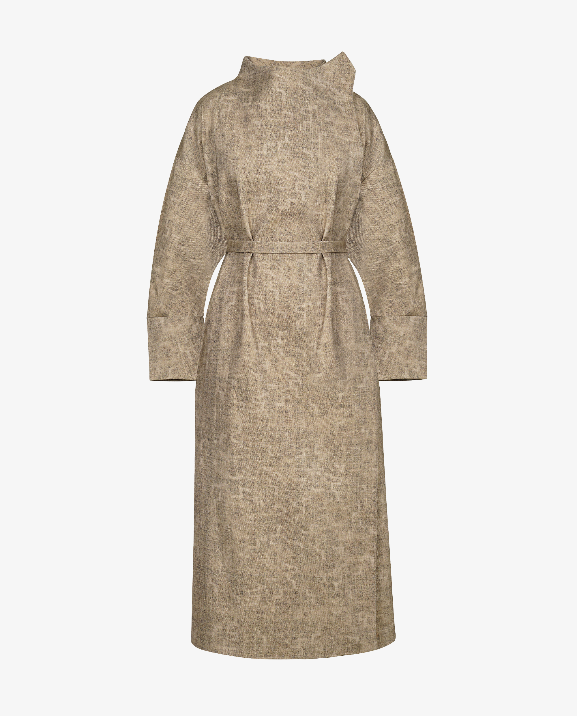 With a complete front overlap and a structured, raised collar fastened by metallic buttons, this coat combines refined style with functionality. Tailored waist darts and a slim back belt give a polished fit, while smooth raglan sleeves add volume, tapering into neat cylindrical cuffs. A deep back slit allows for effortless movement.