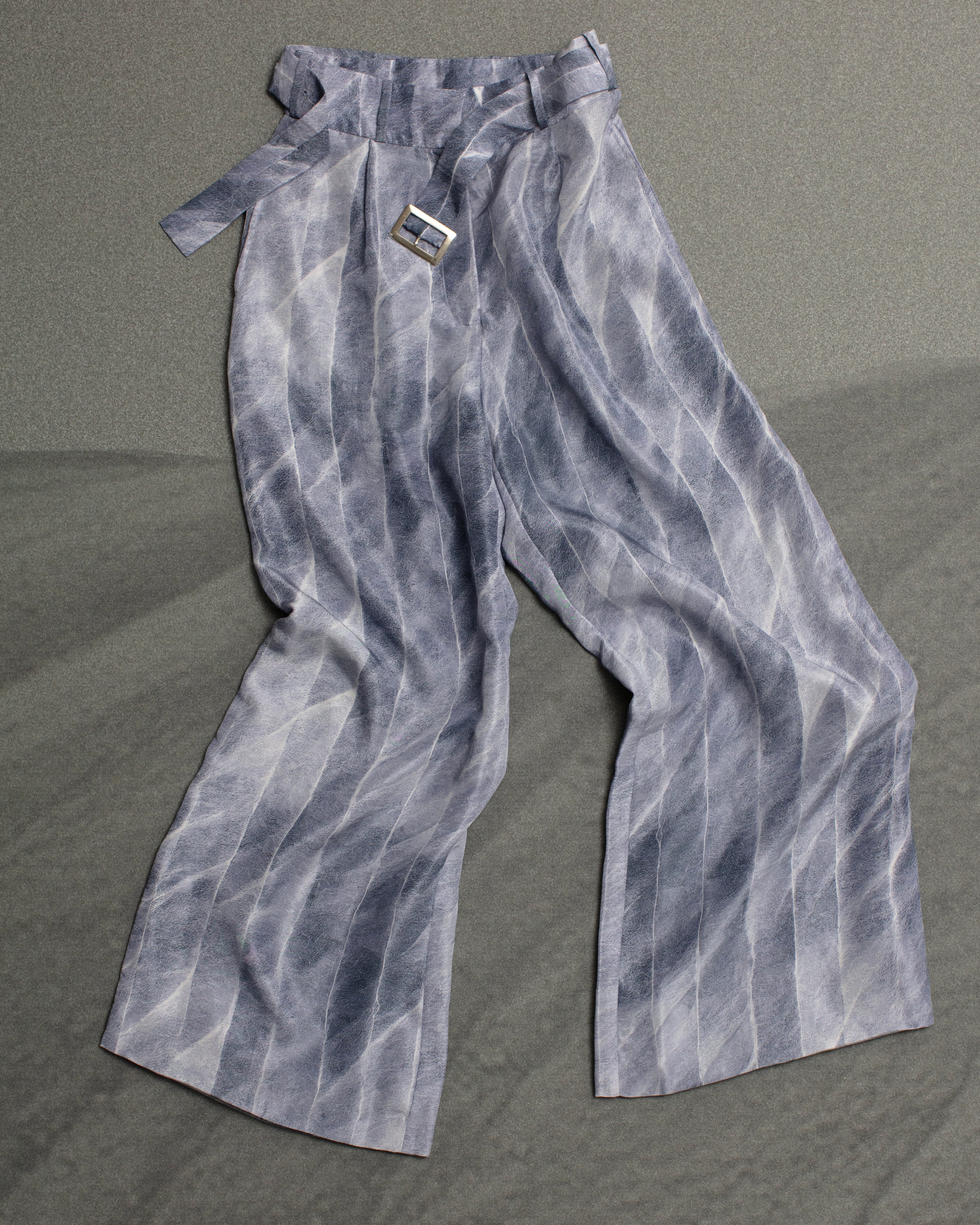 The Granite Pants, crafted from 100% Habutai silk, feature a high-waist design with a detachable belt and metallic buckle.