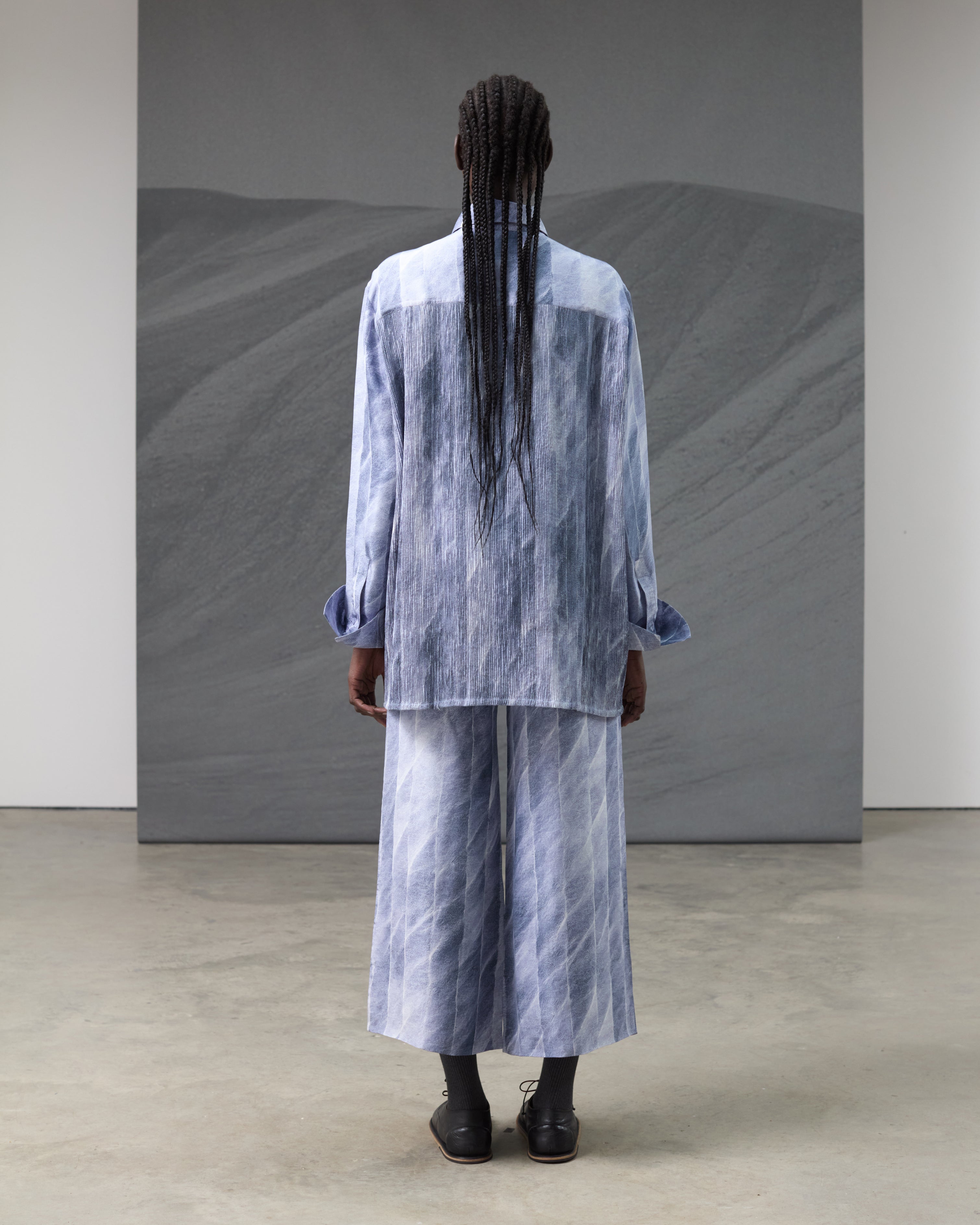 Crafted from 100% Habutai silk, this shirt features columns of micro-pleated pintucks on the front and back, enhancing its sense of structure and refinement. The pintucks are beautifully complemented by a digitally rendered fabric, evoking the textural surface of granite.